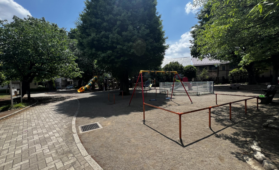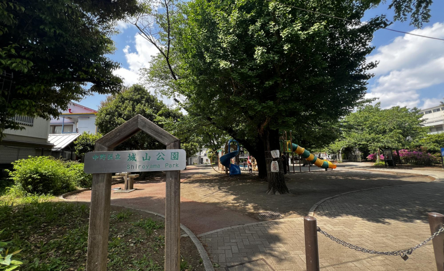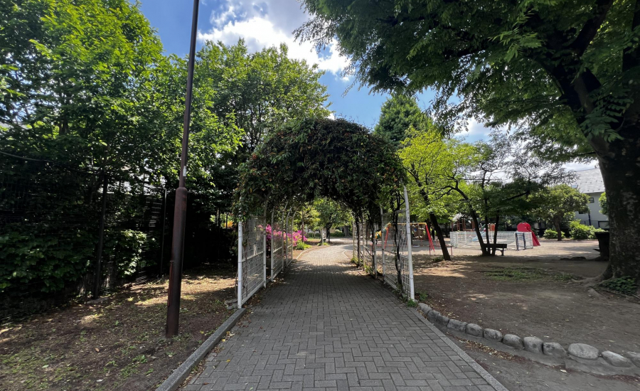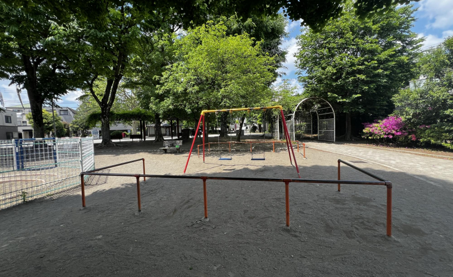中野区立城山公園は、松山公園通り側の入口から入ると、アーチ状のトンネルが目を引く公園です。アーチをくぐると、バラエティ豊かな遊具が広がり、定番のブランコや柵付きの砂場、小さい子ども向けのすべり台などが揃っています。