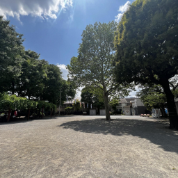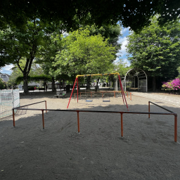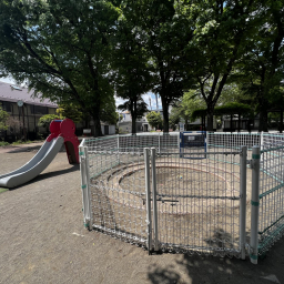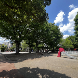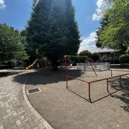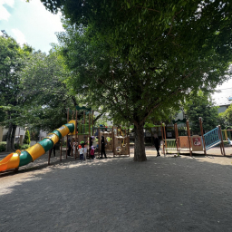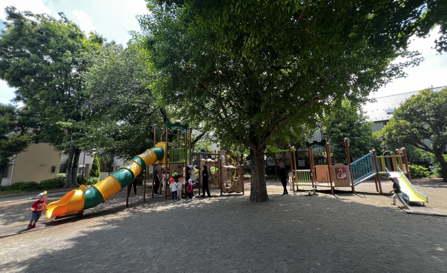 平日には近隣の園児たちも多く訪れ、園内は明るくにぎやかな雰囲気。コンビネーション遊具のそばには背の高い木が植えられており、木陰で直射日光を避けながら遊べるのも嬉しいポイントです。