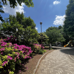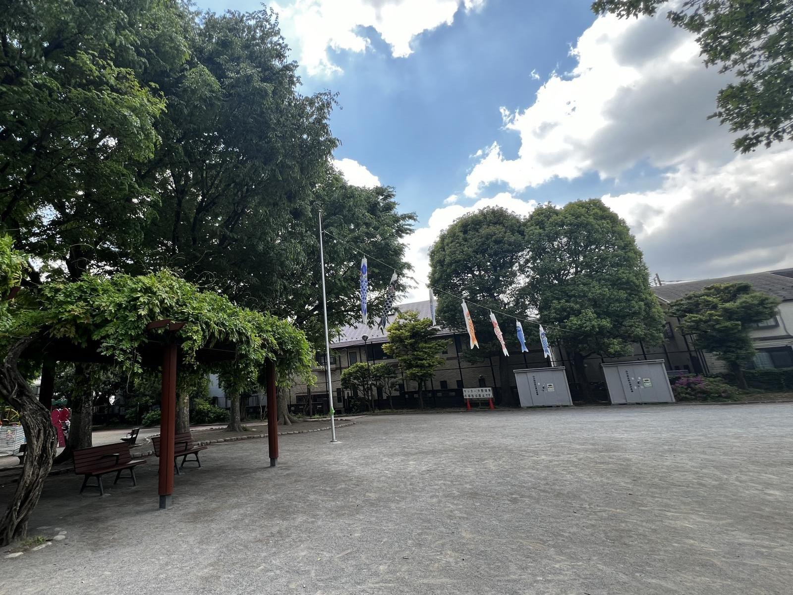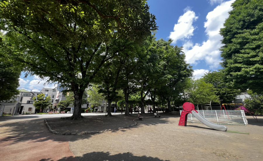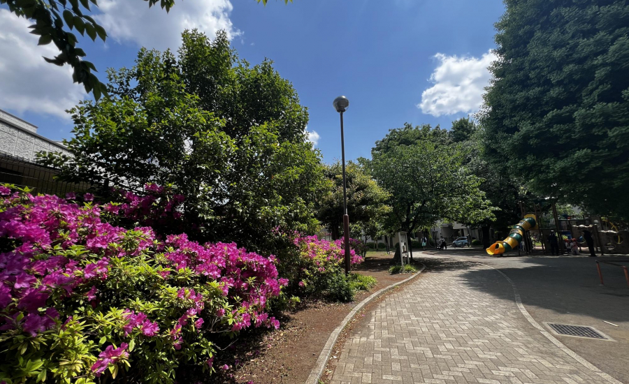 園内には、水道やトイレ、自動販売機、ごみ箱も揃っており、長時間の外遊びでも安心です。桜やアジサイ、イチョウなど季節を感じられる植物も多く、季節ごとに変わる景色を楽しめるのが魅力です。