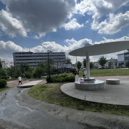 水遊び場の近くには、パラソルのように屋根が広がっているベンチがあり、暑い日でも日陰で水分補給や休憩ができます。なお、水遊び場は夏季限定で開放され、熱中症特別警戒アラートが発令された場合は利用中止となります。開放期間や詳細については、ホームページでご確認ください。