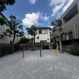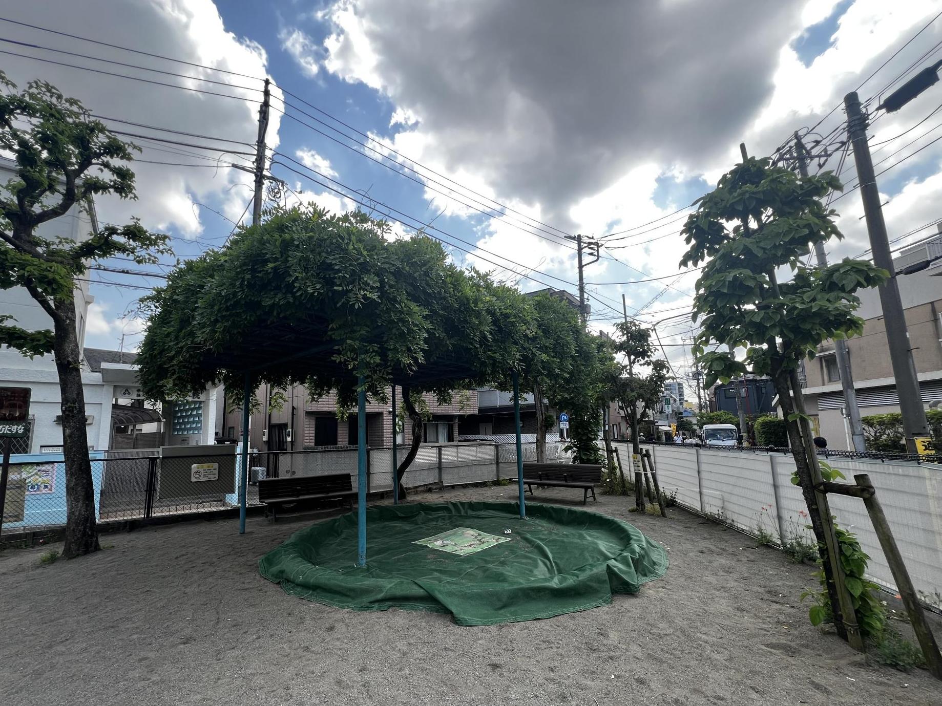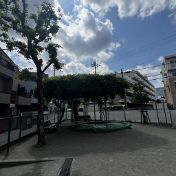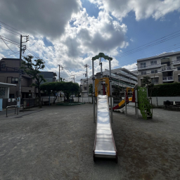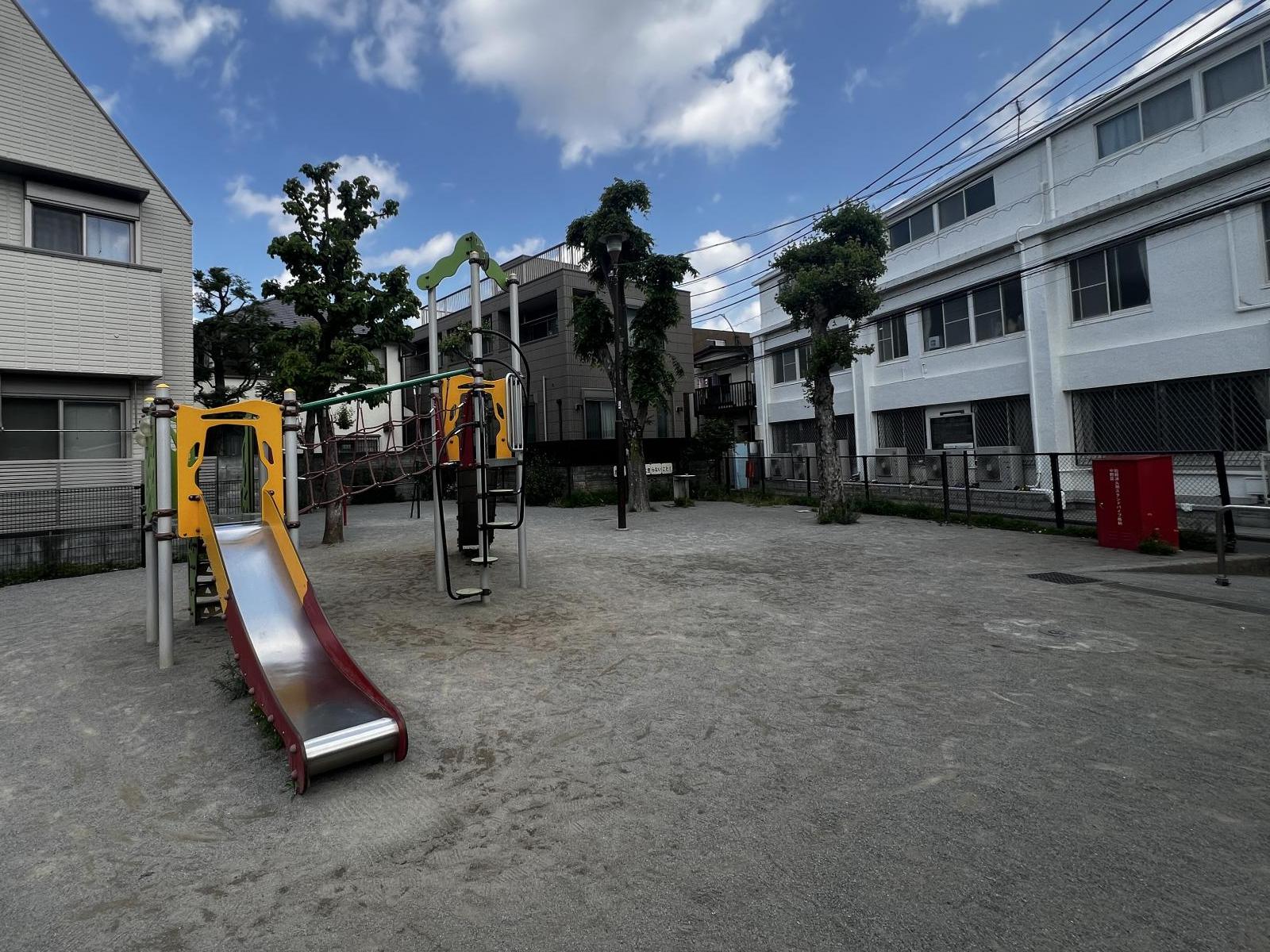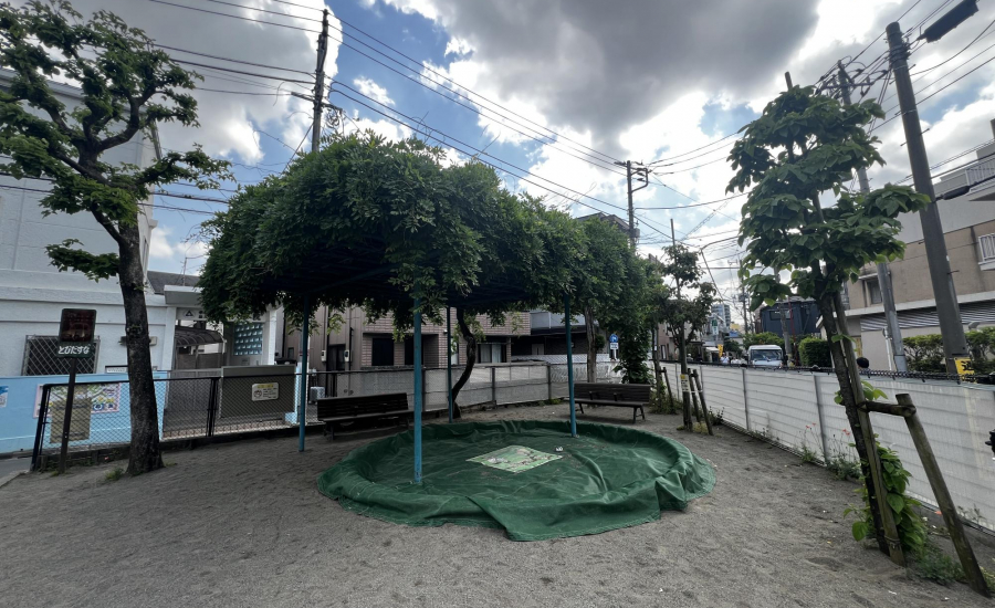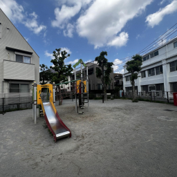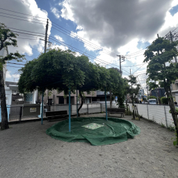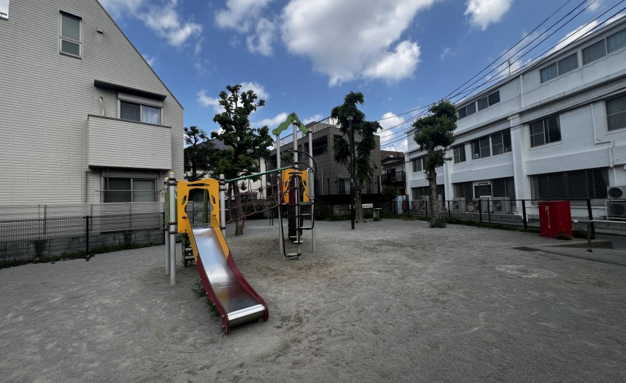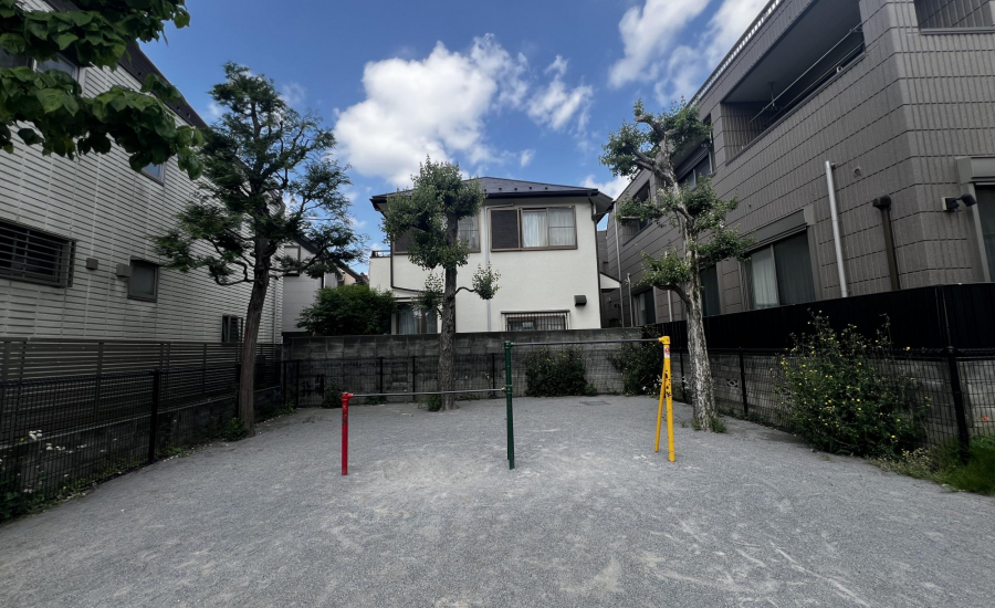 公園の規模はそれほど大きくありませんが、すべり台付きのコンビネーション遊具や砂場、鉄棒など定番の遊具がそろい、幅広い年齢の子どもが楽しめます。園内は三角形の形をしており、二辺が道路に面していますが、柵で囲まれているので安心です。全体が見渡しやすく、子どもを見守りやすいのも魅力ですよ♪