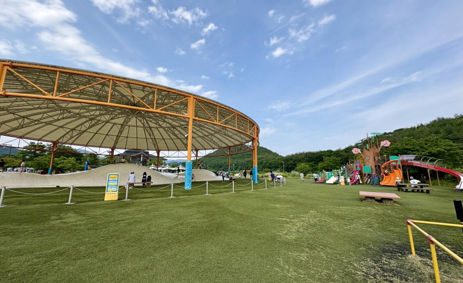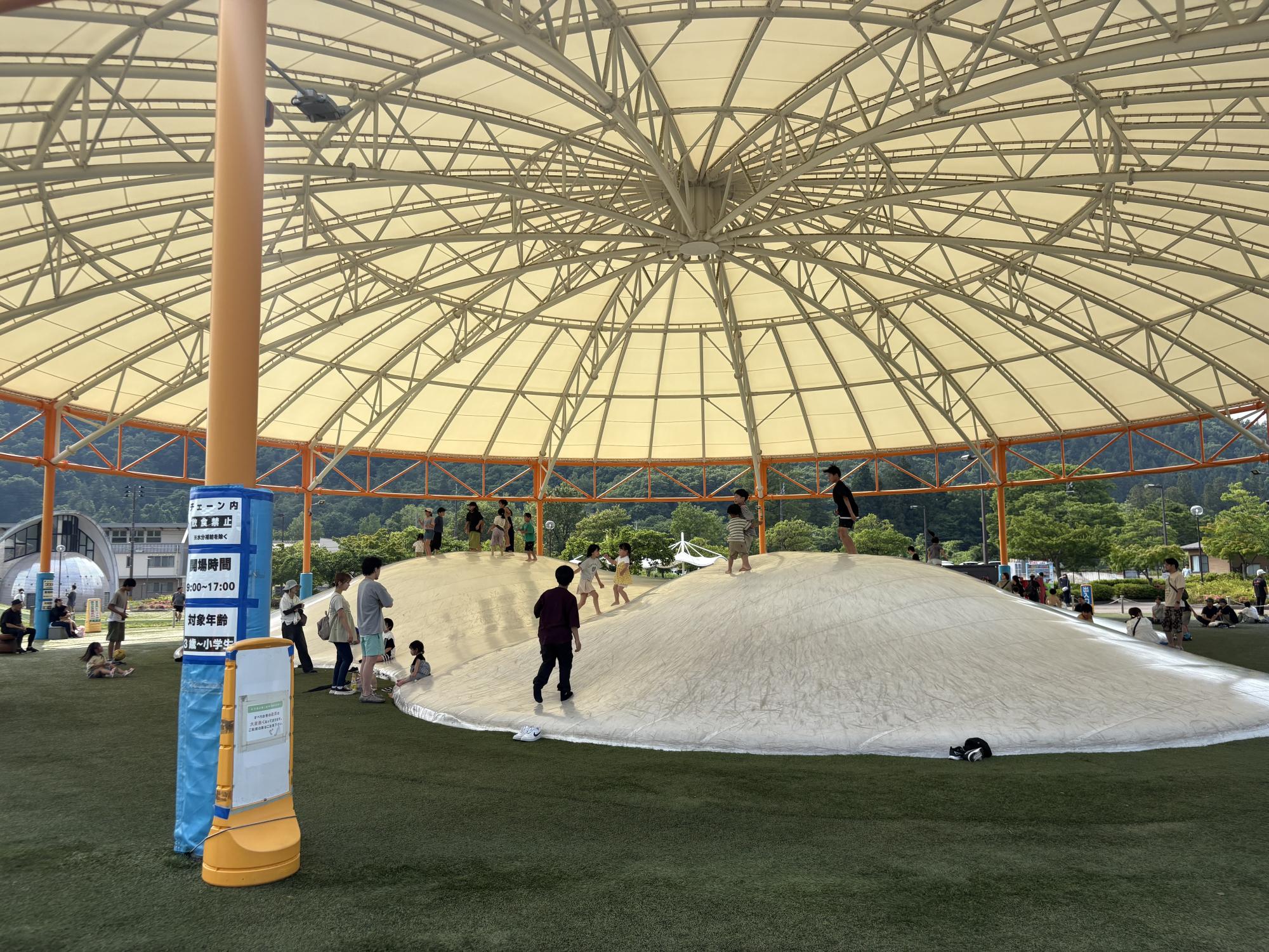 十六沼公園で子どもたちに大人気なのが「ぴょんぴょんドーム」。屋根付きなので暑さや日差し、急な雨でも気にせず遊べる安心設計なのがとにかく嬉しい!屋根があるだけで体感温度もグッと下がるので、ちょっと暑い夏でも比較的涼しみながら遊べました♪