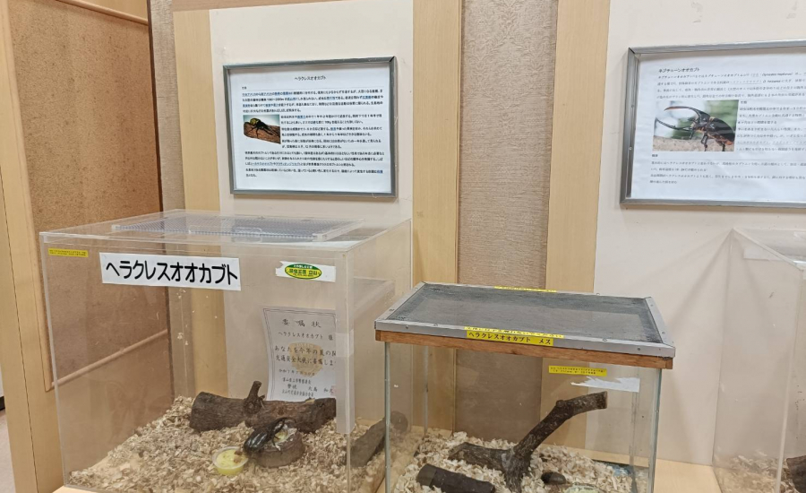 館内にはさまざまな種類のカブトムシやクワガタが展示されており、標本のほか、実際に飼育されている昆虫もいます。