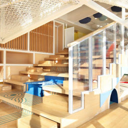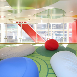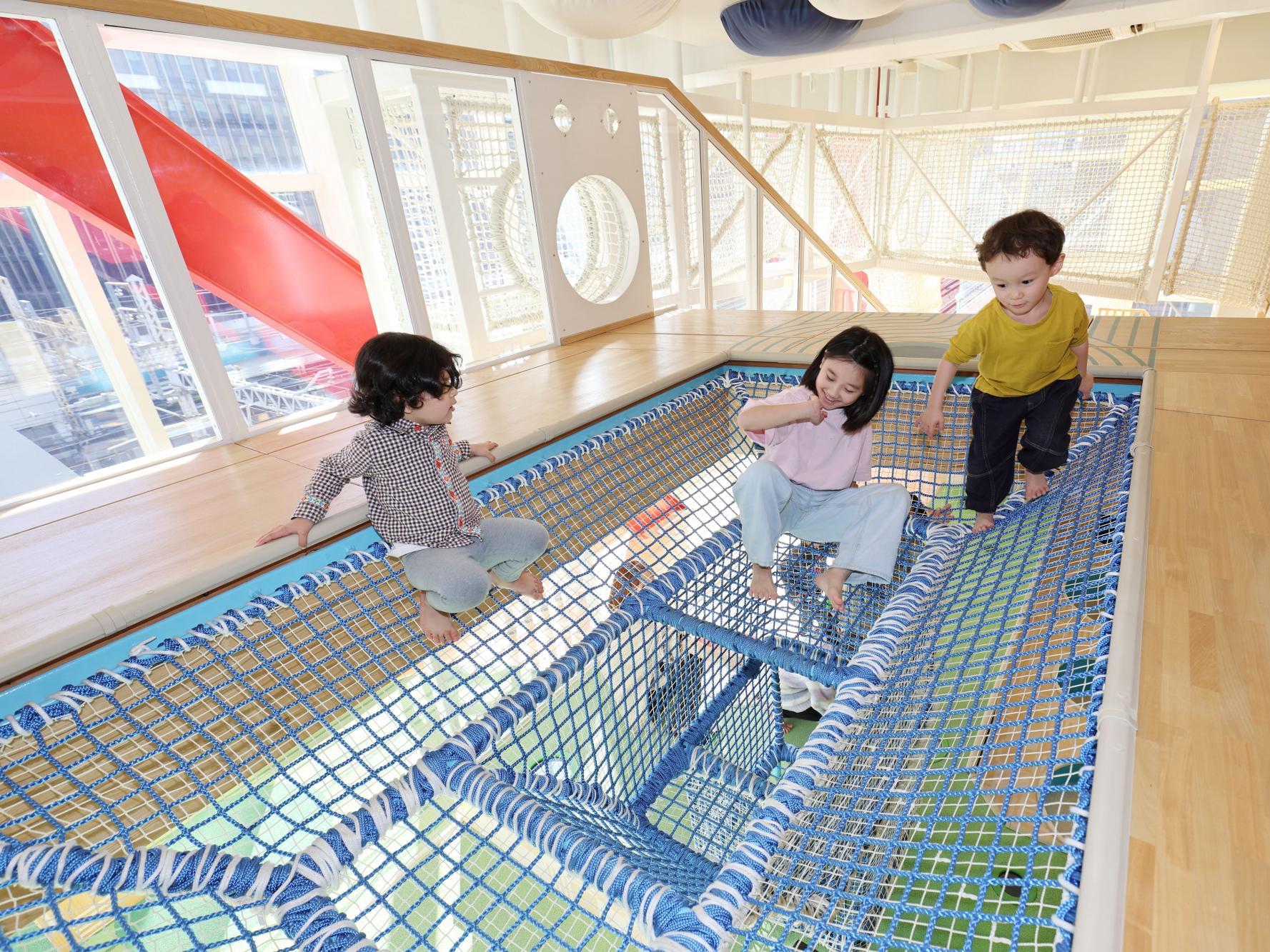 明るい陽射しを取り込める大きな窓や2フロアが吹き抜けになった空間は、室内にいることを忘れさせる開放感!遊び疲れた子たちはリラックスできるよう、大きなクッションに身を任せてゆったりゴロゴロできるエリアや、おもちゃでじっくり遊べるエリアも用意されています。