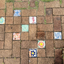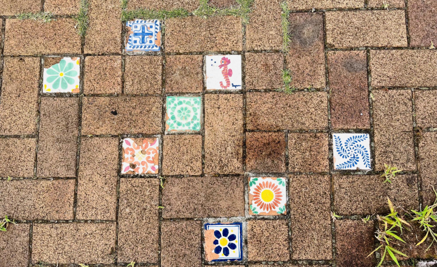 入口にはレンガで作られたおしゃれな表札があり、床には花やタツノオトシゴのタイルがちりばめられています。まるで宝探しのように、タイルを見つけるたびに子どもたちの目がキラキラと輝きます。