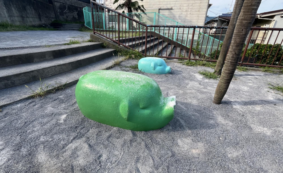 そして、一角には、カラフルなブタのオブジェが!ころんと丸いフォルムがなんとも愛らしく、思わず写真を撮りたくなってしまう可愛さ。ベンチのように腰かけることもできるので、ちょっと一休みにもぴったりです。