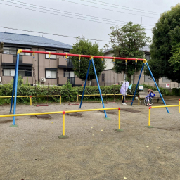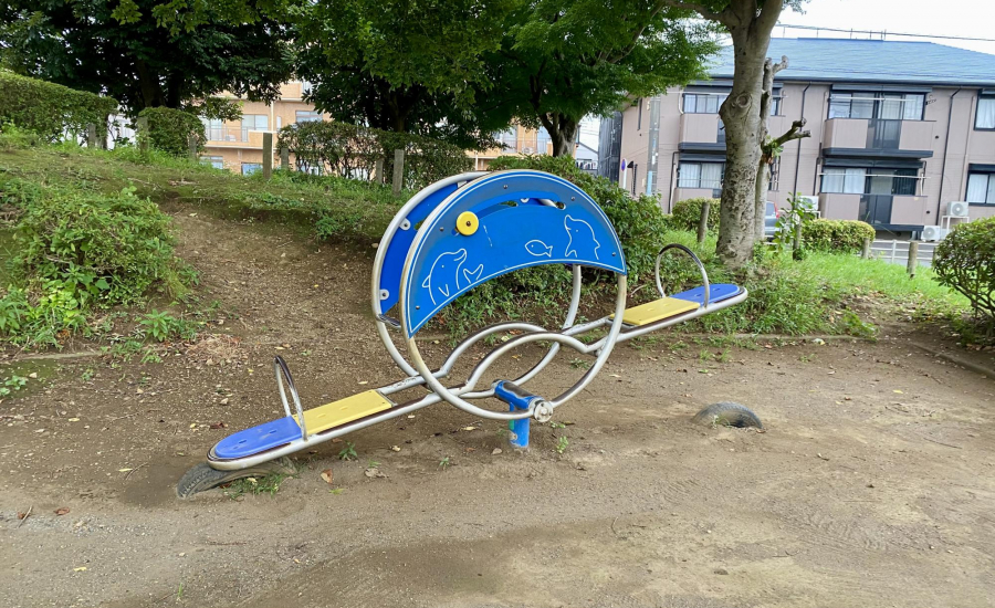大きな遊具はないですが、丘のすべり台やイルカのシーソーといったユニークな遊具が魅力です。広場でのびのび遊べるので、子どもの体力発散にもぴったりな公園でした。周囲は住宅に囲まれており、車の往来も少ないです。