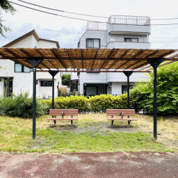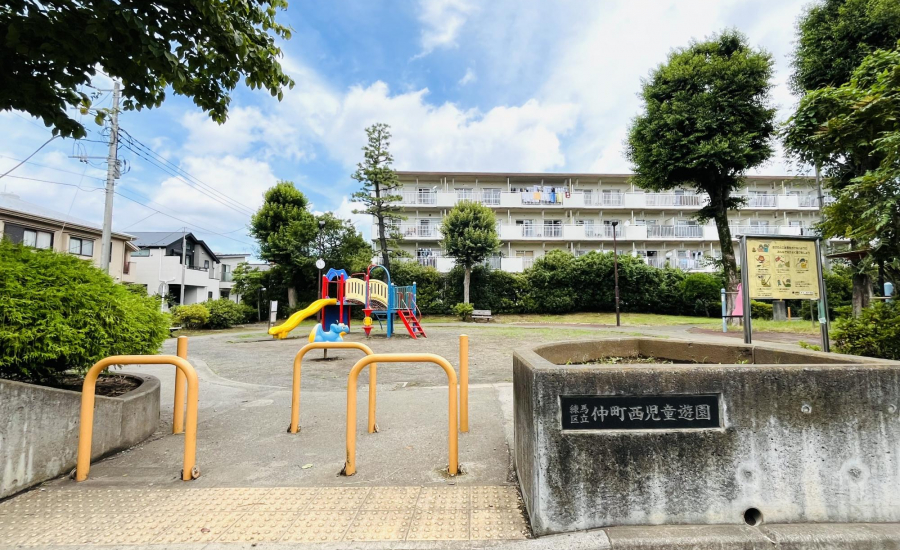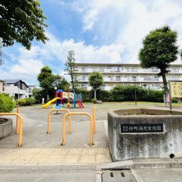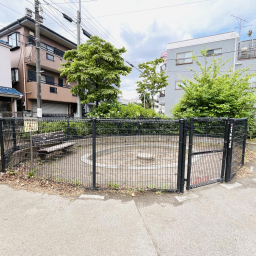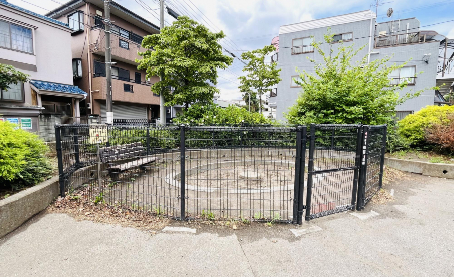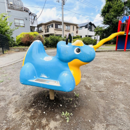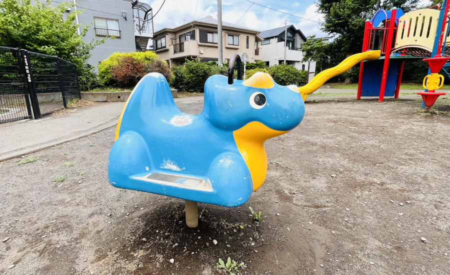また、青い恐竜のスプリング遊具は小さな子どもにぴったり。砂場はフェンスで囲まれており、猫などが入れないので清潔に保たれています。中にはベンチも設置されているので、パパやママが近くで安心して見守ることができますよ。兄弟姉妹やお友だちと一緒に、年齢に合わせた遊びを楽しめる環境が整っています。