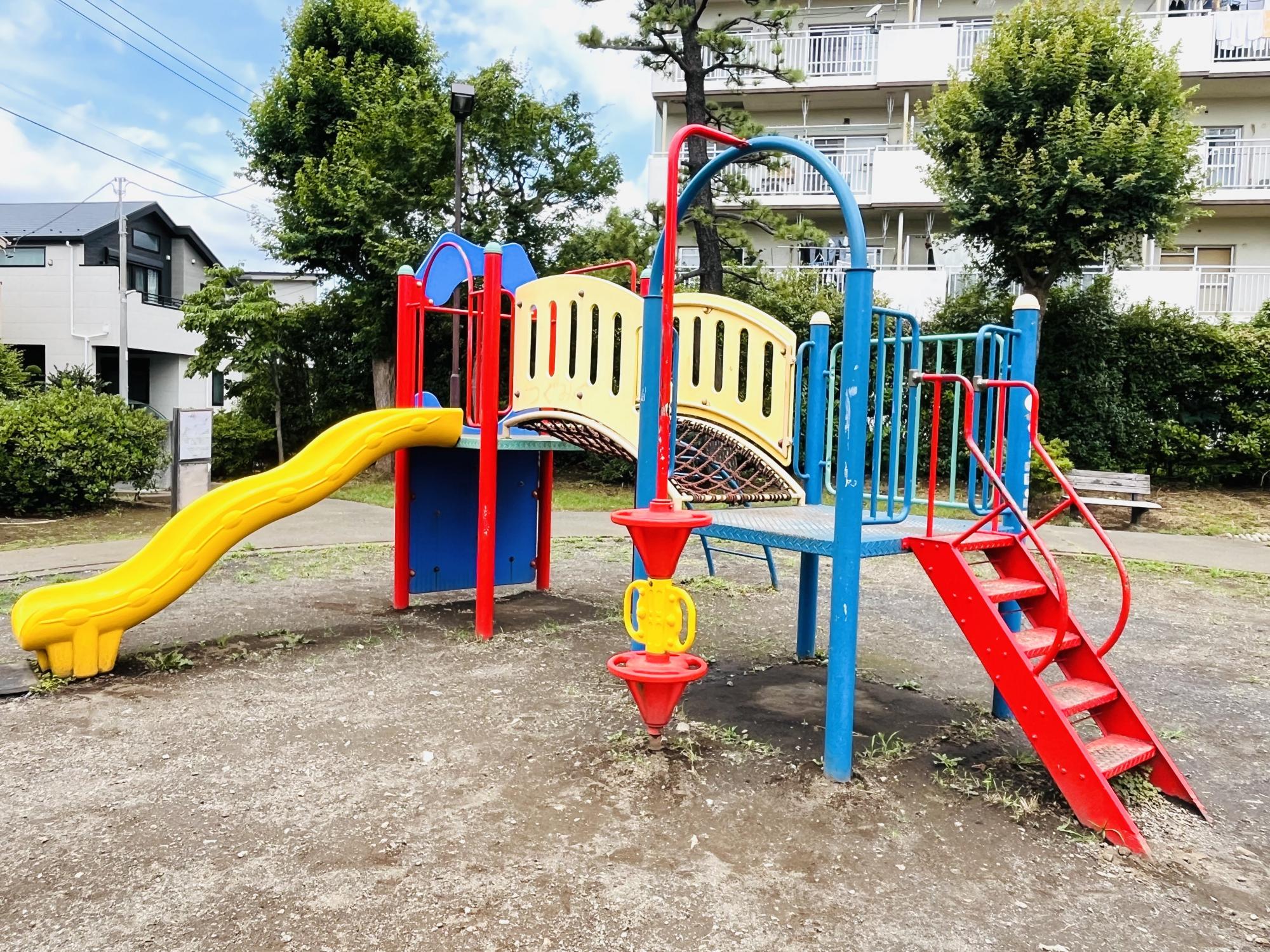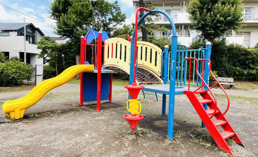 園内でまず目を引くのは、カラフルな複合遊具。遠くからでも存在感があり、通りすがりの子どもが「遊びたい!」と駆け寄ってしまうほどの人気スポットです。階段は普通に上り下りするだけでなく、ボルダリングのように足を引っ掛けながら上れる遊び心のある設計。体をめいっぱい使って楽しめるのが魅力です。