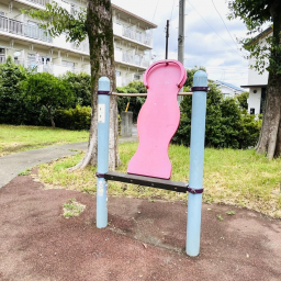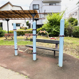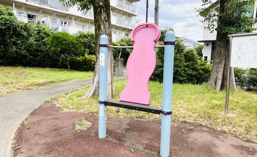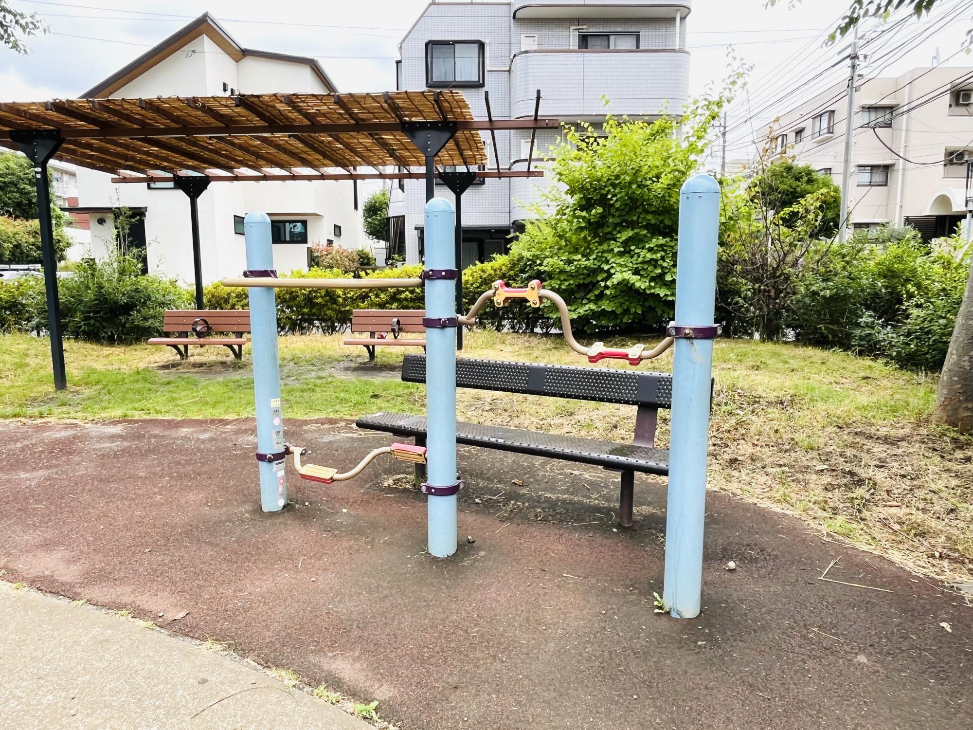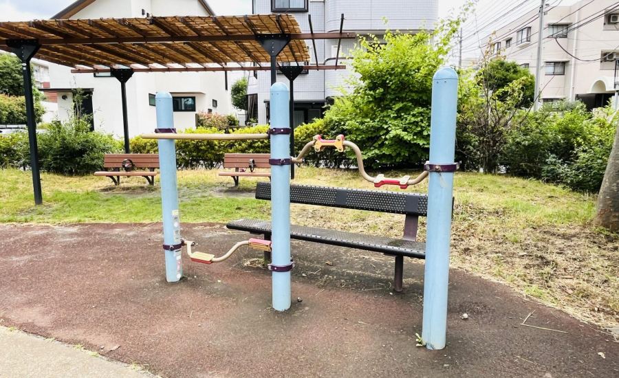 児童遊園でありながら、園内には大人向けの健康器具が設置されています。「サイクルステーション」「背のばしステーション」と呼ばれており、親も一緒に体を動かせます。