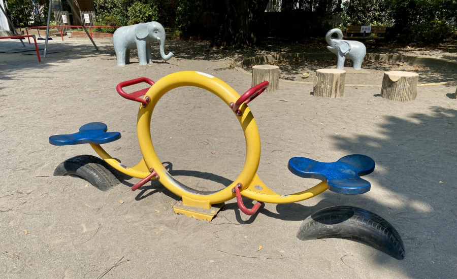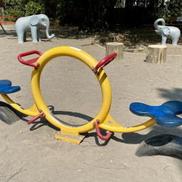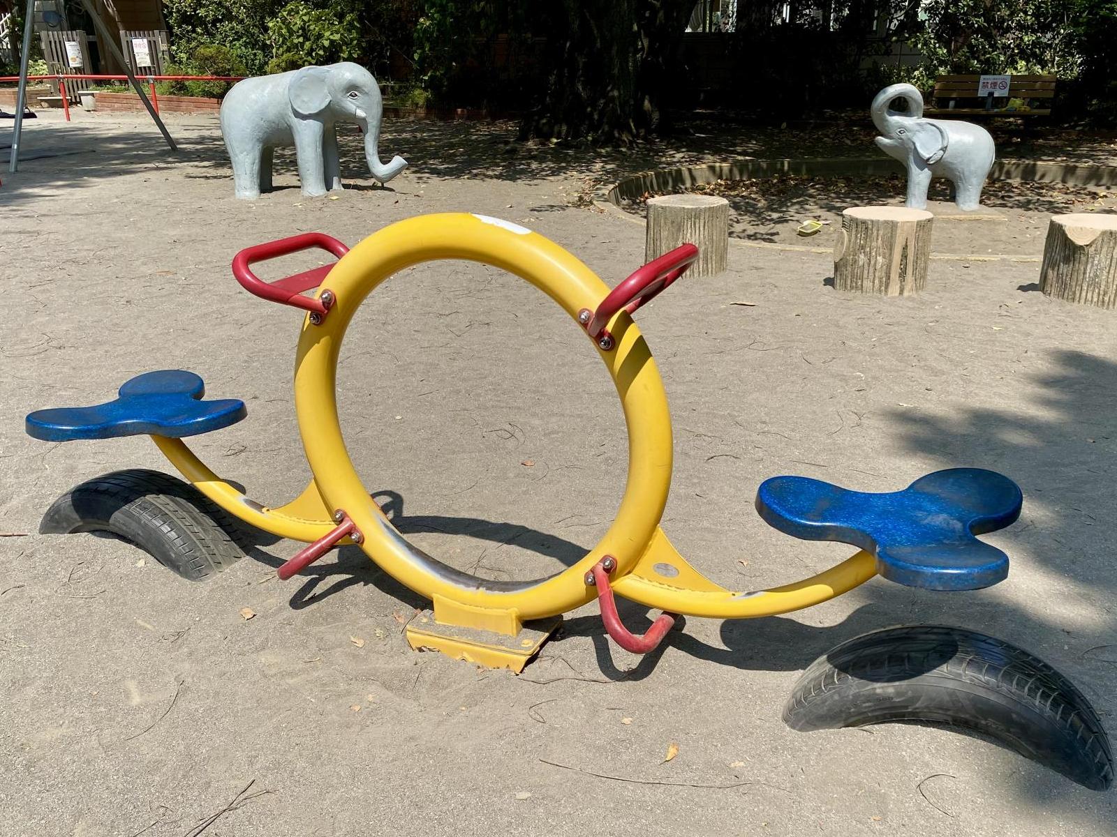 まず目を引くのは、黄色い輪っかが中心にある変わった形のシーソー。ふつうのシーソーとは違って、見た目もユニークで子どもたちの好奇心をくすぐります。
