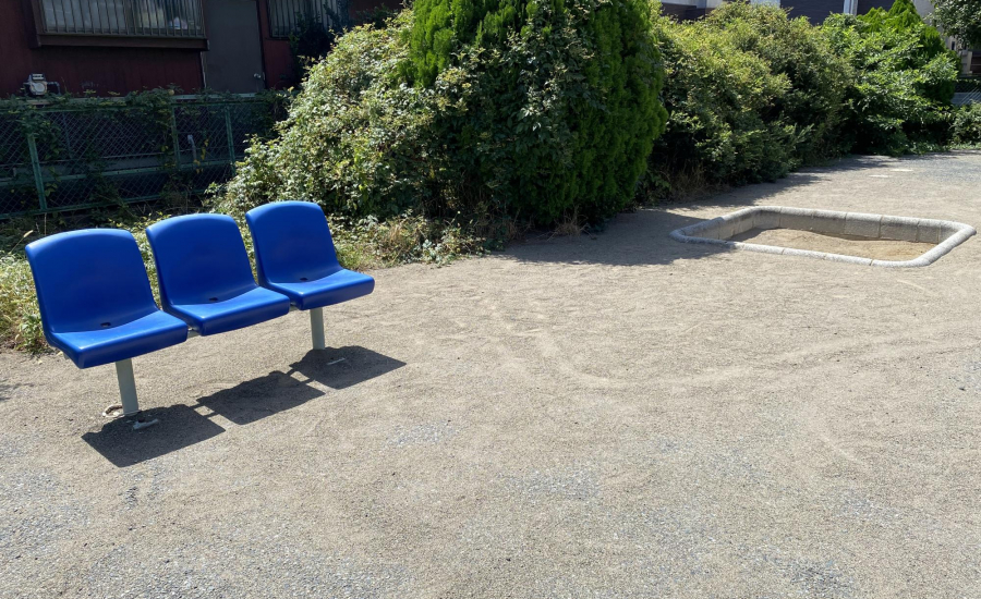 公園全体は砂地になっており、走ったり座ったりと、自由に体を動かせるスペースが広がっています。地面が砂なので、木の枝などでお絵描きをする子もいます。柔らかいボールで遊んだり、鬼ごっこをするにもちょうどいい広さです。園内には2箇所にベンチが置かれているので、保護者が腰をかけてのんびりと見守ることもできますよ。