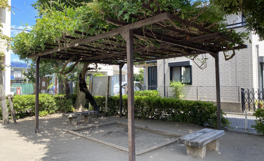 また、藤棚の下にある砂場は木陰になっていて、夏でも比較的涼しく遊べます。砂場遊びは手先の発達や想像力を育む遊びとしておすすめで、小さな子どもでも親と一緒にじっくり楽しめます。