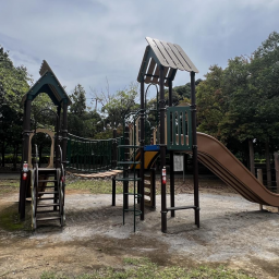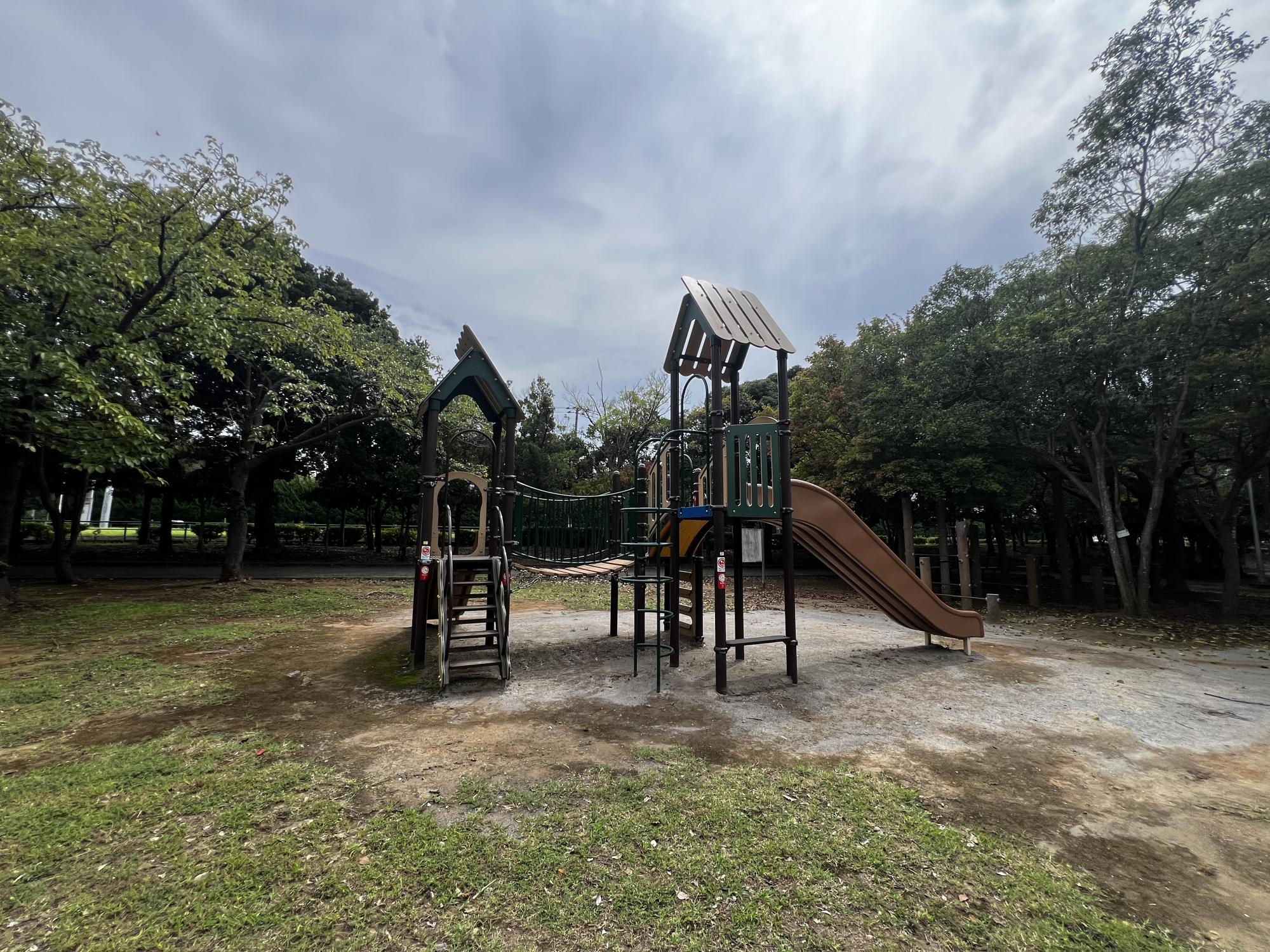 遊具広場には、森の中の小屋をイメージした温かみのある複合遊具が設置されていて、まるで絵本の中の世界に迷い込んだような雰囲気です。吊り橋や階段にはしっかりとした柵がついているので、小さなお子さんでも安心して遊ぶことができます。探検気分ですべり台をすべったり、ゆらゆら揺れる吊り橋をドキドキしながら渡ったりと、子どもの好奇心をくすぐる仕掛けがいっぱいですよ。