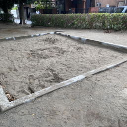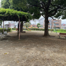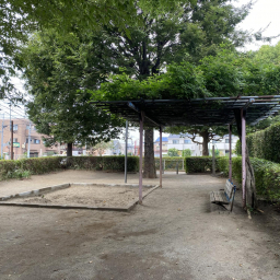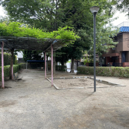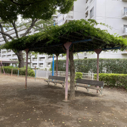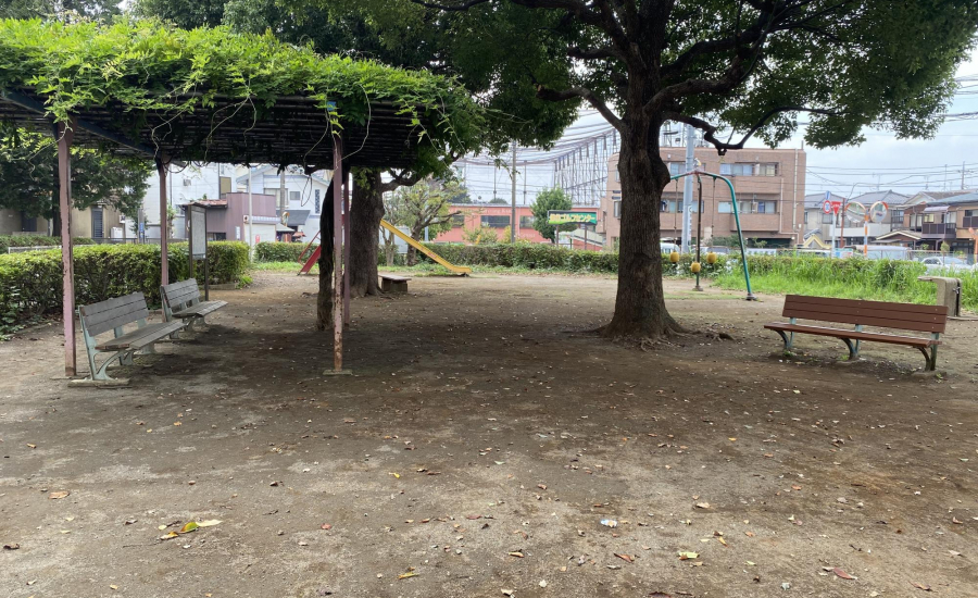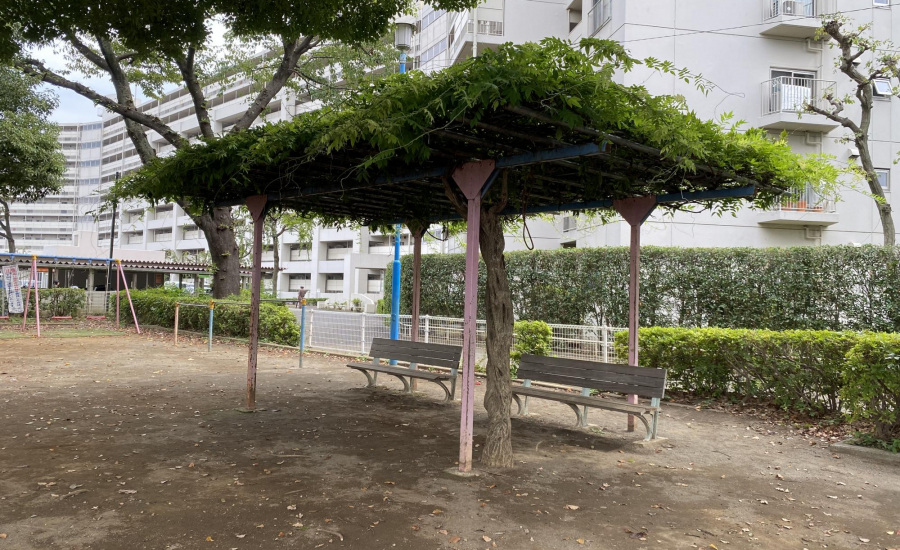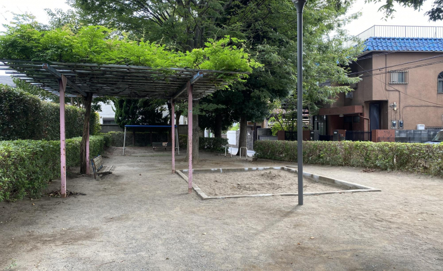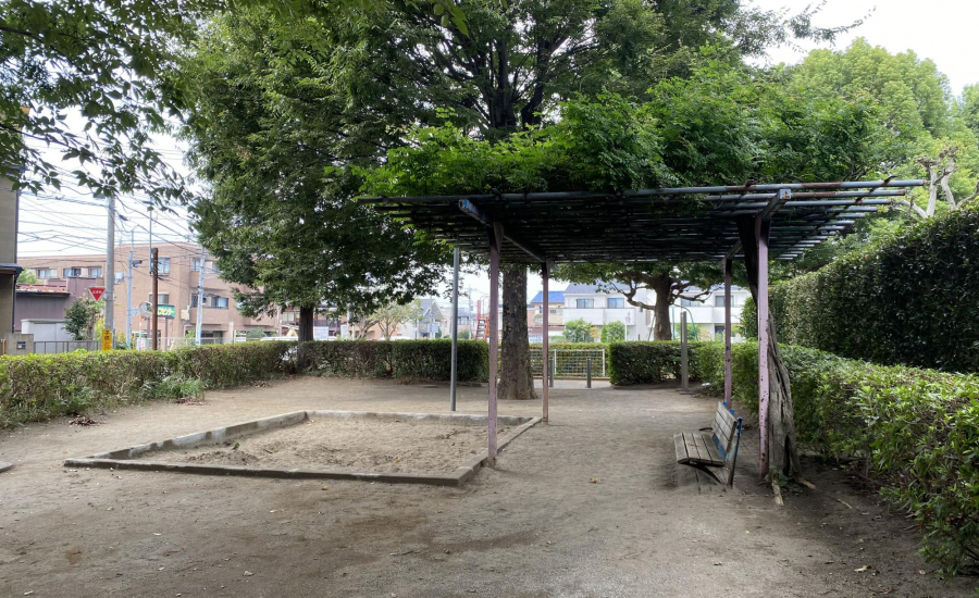 公園内には砂場もあり、幼児でも安心して遊べる環境です。大きな藤棚の下にはベンチが設置されており、木陰で一息つきながら子どもを見守れるのも魅力。水飲み場もあるので、遊んだ後に水分補給ができ、長時間の利用にも安心です。
