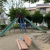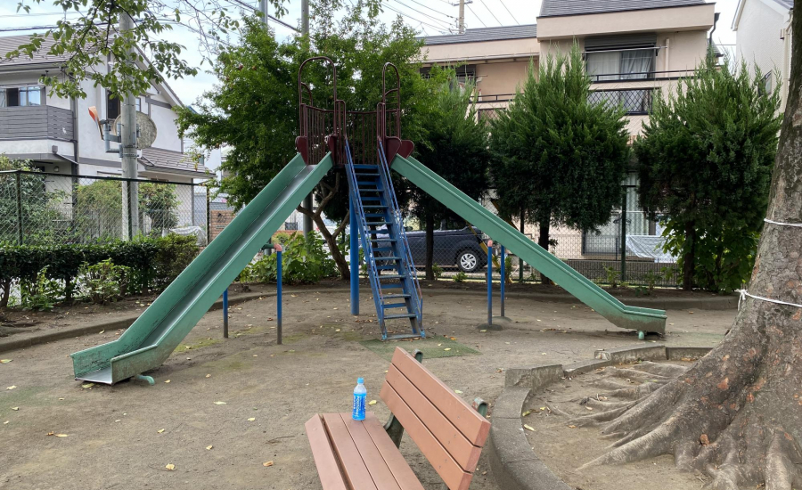 遊具エリアにはブランコや二股に分かれた滑り台、大きな藤棚の下に砂場が整備されており、季節を問わず子どもたちに人気です。砂場は木陰で涼しく、小さな子どもにも安心。遊具エリアのそばには大きな木が植えられていて、その木を囲むようにベンチが設置されているため、親が腰を下ろしながら子どもを見守れる環境が整っています。