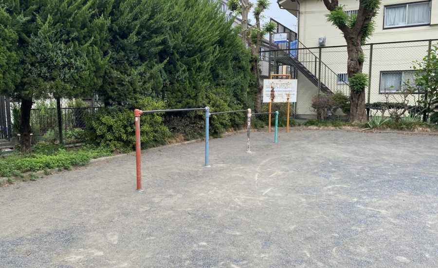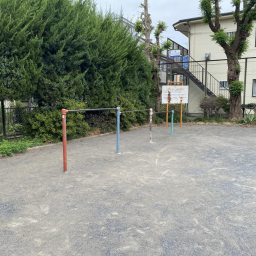 広場の端には鉄棒が設置されていて、体を鍛えたり友達と一緒に挑戦したりできるのも魅力です。広場部分は遊具がない分スペースにゆとりがあり、鬼ごっこや縄跳び、ストライダーなど、子どもたちが自由に遊びを工夫できる環境になっています。
