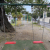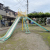 たくさんのカラフルな遊具が並ぶ細長い公園♪