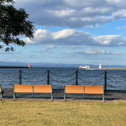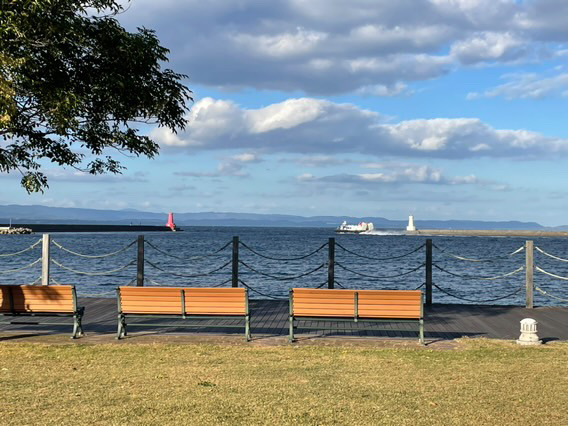 車の場合は、かんたん港園内の有料駐車場をご利用くださいね。(1時間無料/以降1時間ごと100円、123台・車椅子用あり)