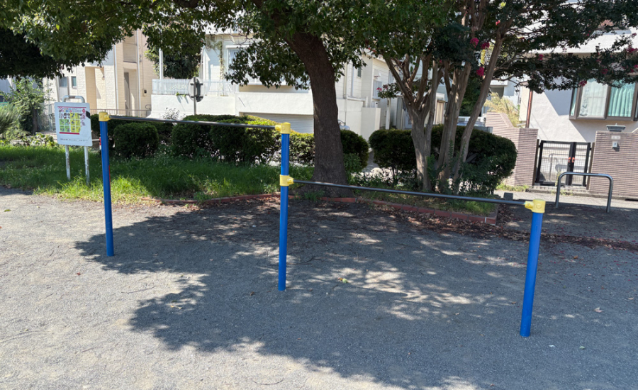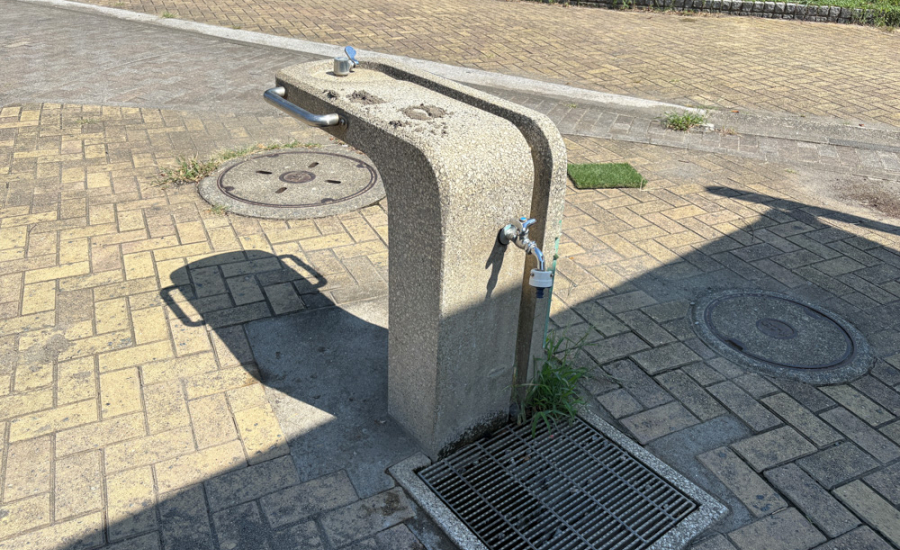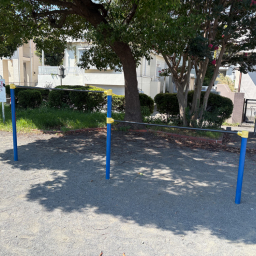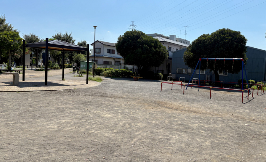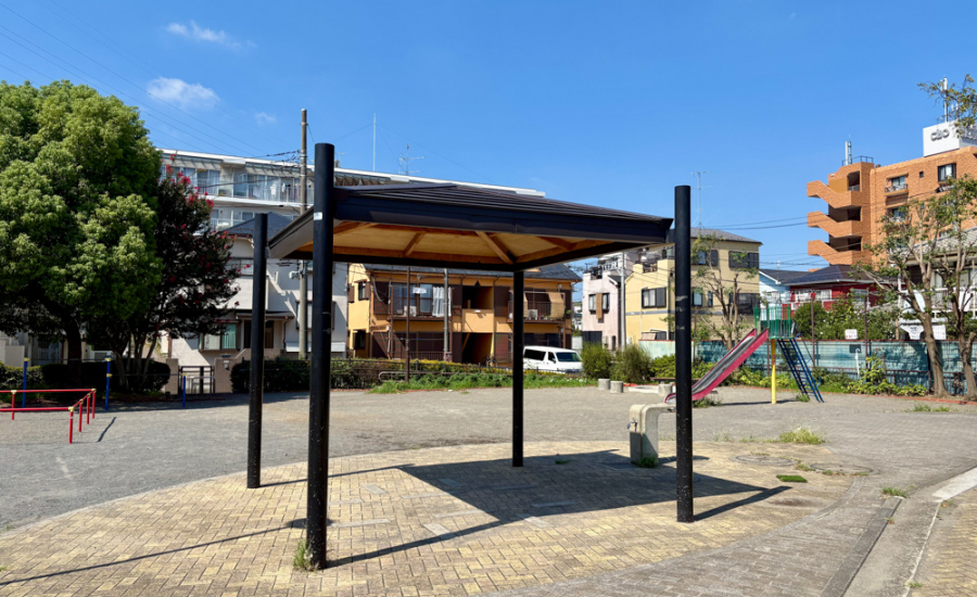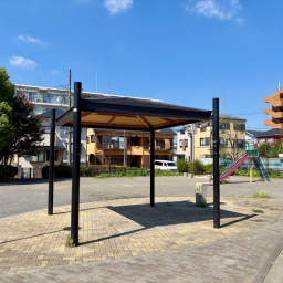 木陰があまり多くないですが、東屋が影を作ってくれるので、暑いときには休憩できるスポットがあるのが嬉しいです。水道もあるので公園で遊んだあとに手を洗って帰れるのも安心ですね。