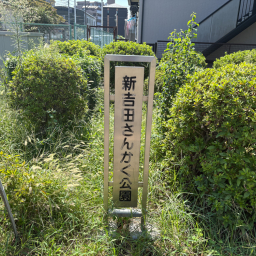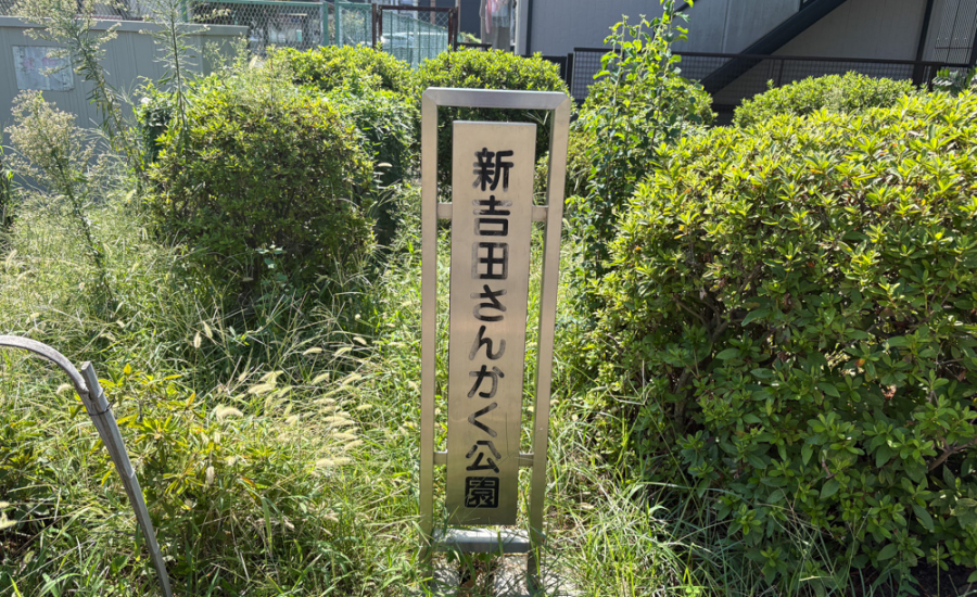 新吉田さんかく公園は、倉部谷戸遊歩道に面した公園で、その名の通り、さんかくの形の敷地をした公園です。