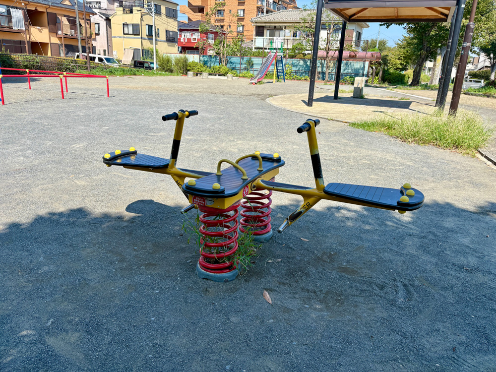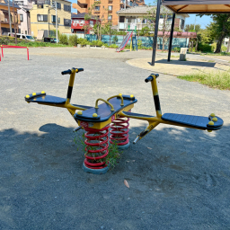 定番遊具が揃う中、なかなか見かけないスプリングタイプのシーソーがあります。子ども一人で遊ぶとき、いつものシーソーだと反対から押して動かしてあげるのが意外と大変ですよね。これなら子どもが自分の力で動かせたり、少しの力を加えてあげれば動くのでママとパパの負担がちょっぴり減らせます。また、普通のスプリング遊具は一人で乗るものが多い中で、お友だちと一緒に揺れる感覚を楽しめるという点も面白いです♪真ん中にも乗れるところがあるので、2人以上でも遊べちゃいます。お友達と顔を見合わせながら遊ぶと自然と笑顔があふれますね。