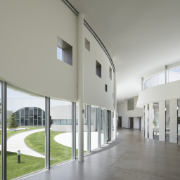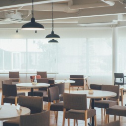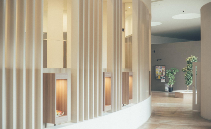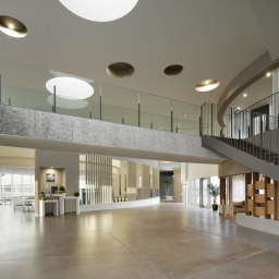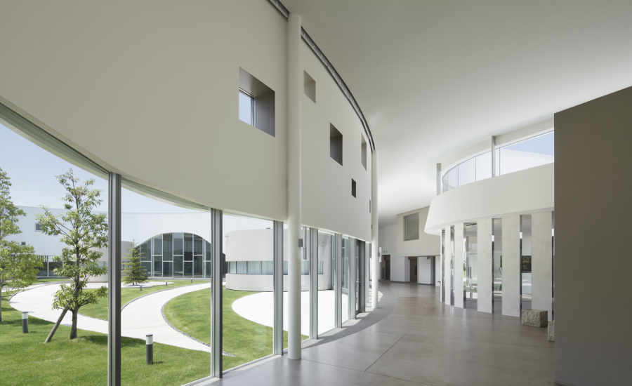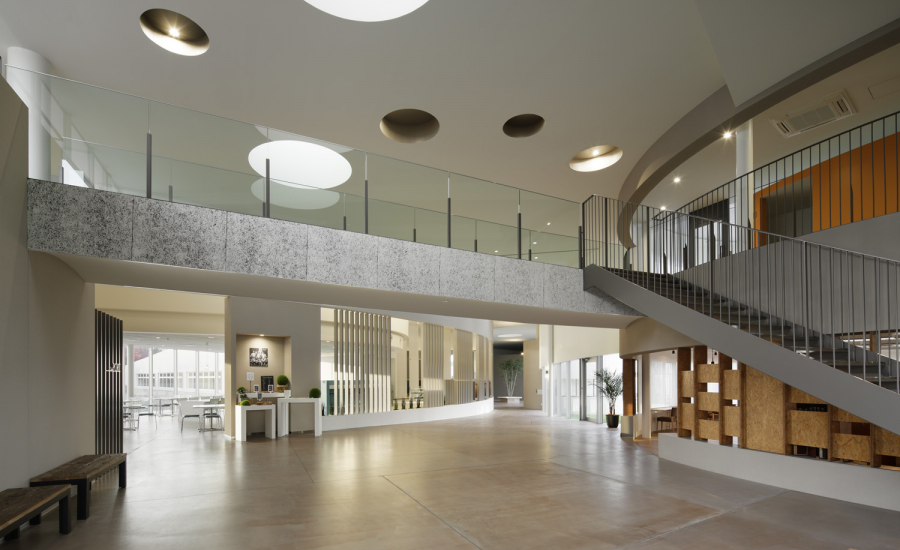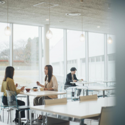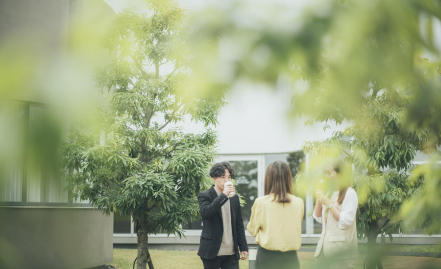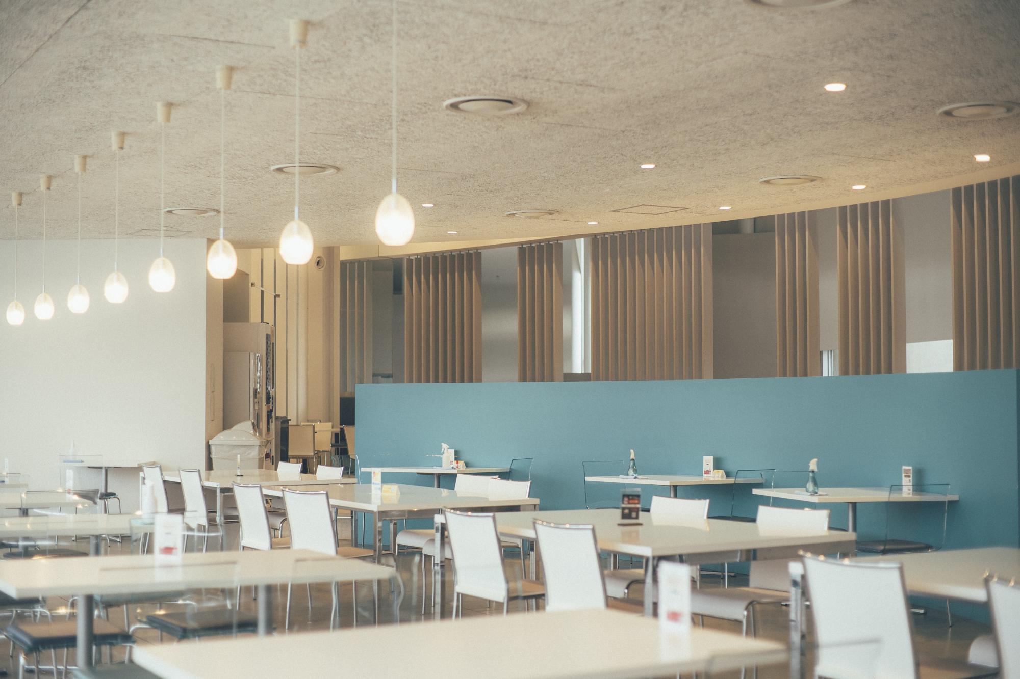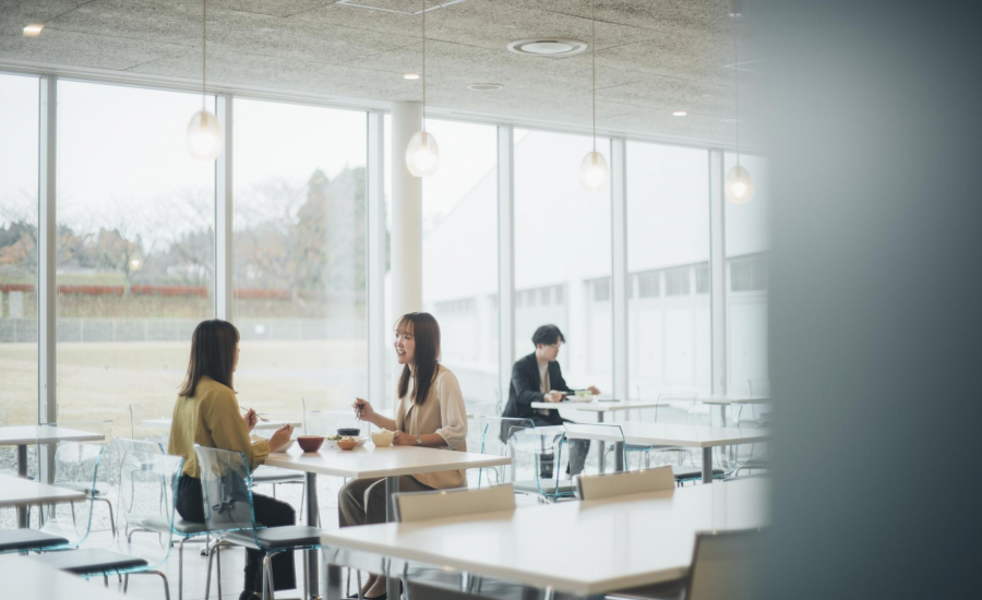 職場となる富山BPOタウンは、緑の映える中庭がオシャレな建物。天井が高く解放感のある社内には、健康的なメニューがコスパ抜群で食べられるカフェテリア、ジムスタジオ、リフレッシュルームも完備されていますよ。