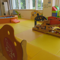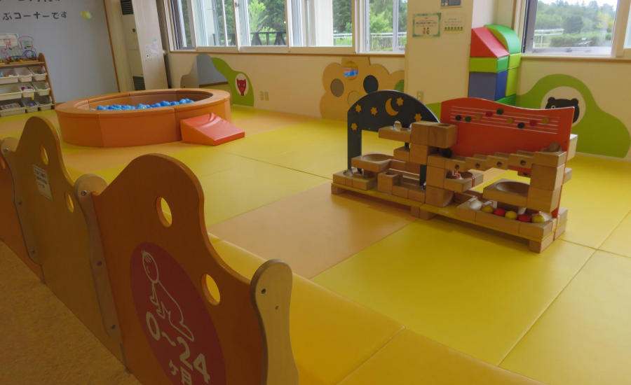 ハイハイの赤ちゃん専用エリアや、小さなお子さんの遊具やおもちゃも大充実♪特に、おままごとハウスや大工さんのお家が人気ですよ。
