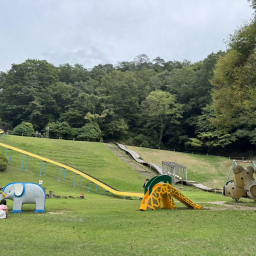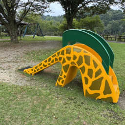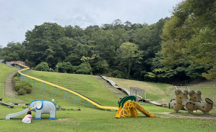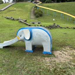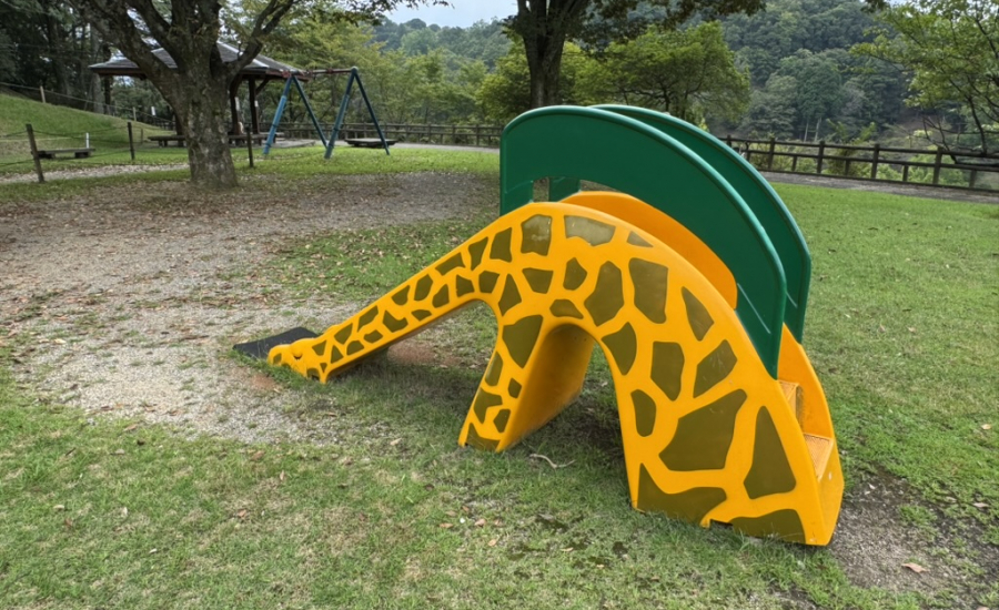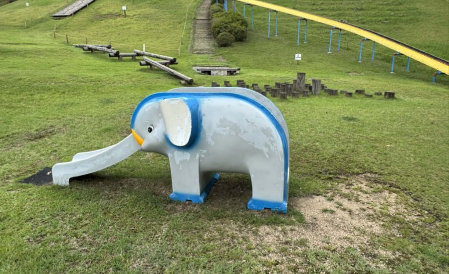 ゾウやキリンの滑り台は遊具デビューのお子様におすすめ。遊具の手前はフラットな芝生が広がっているので、歩き始めの小さいお子様も一緒に遊べます。遊具スペースまでは坂道で、ベビーカーを押していきながら移動が可能です!