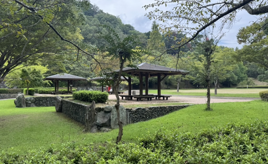 屋根付きのベンチでは、小雨が降ってもお弁当を広げてピクニックが楽しめます。熱中症が不安な方でも、遊び疲れたら屋根の下に入ってひと休みできますね。近くには自動販売機があるので、水分補給をしながら広々とした土地で自由に遊べます。