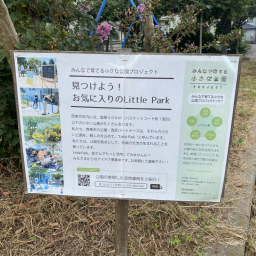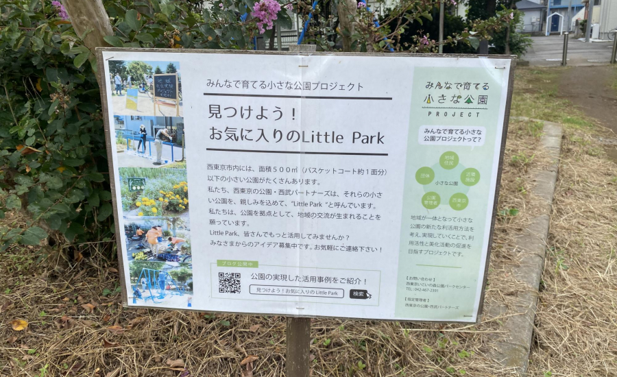 公園内に入るとまず目に入るのが、「みんなで育てる小さな公園project」の看板。地域の人々が主体となって公園の新たな使い方や、より良い姿を考え、実際に形にしていく取り組みが行われている公園です。