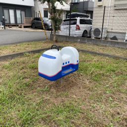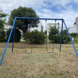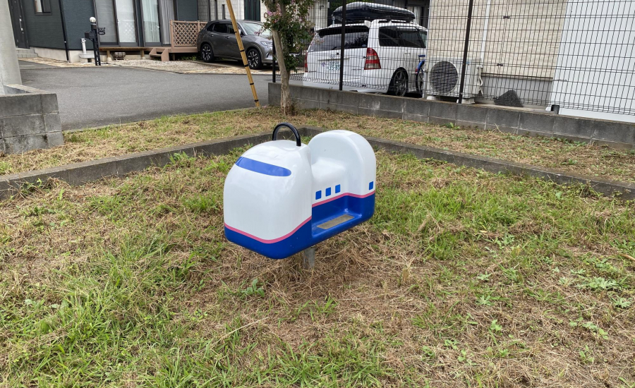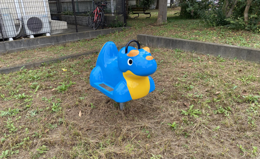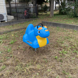 2人乗りのブランコ、藤棚で日差しが遮られた砂場、そして恐竜と新幹線をかたどった可愛らしいスプリング遊具が2台。スプリング遊具は小さい子どもに人気で、設置されたばかりのようでピカピカ綺麗な状態です♪