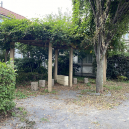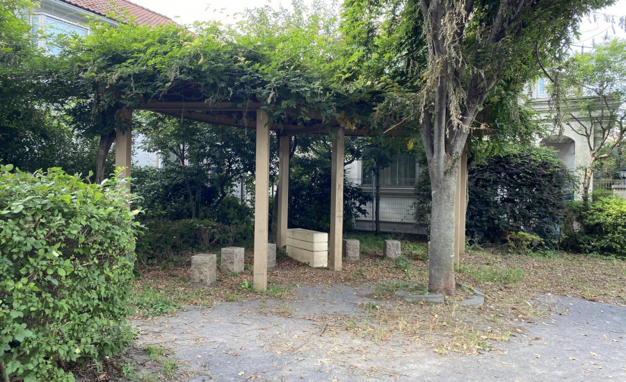 さらに、砂場とは別にもう一つ大きな藤棚があり、その下にはスツールがたくさん並んでいます。ちょっとした休憩やおしゃべりに最適な憩いスペースになっています♡