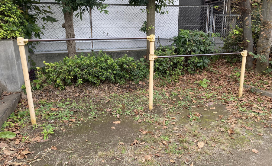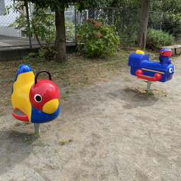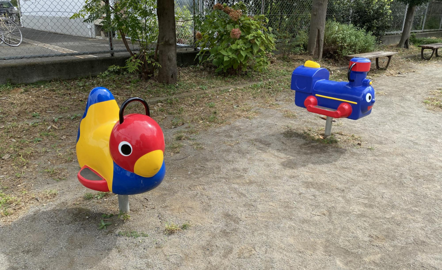 公園内の遊具は、鉄棒、滑り台、そして鳥と汽車の形をしたスプリング遊具が2台設置されています。