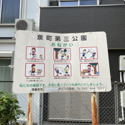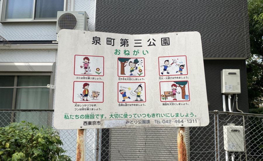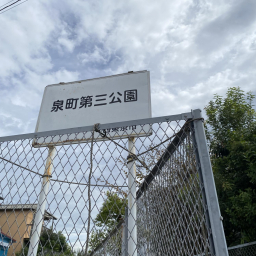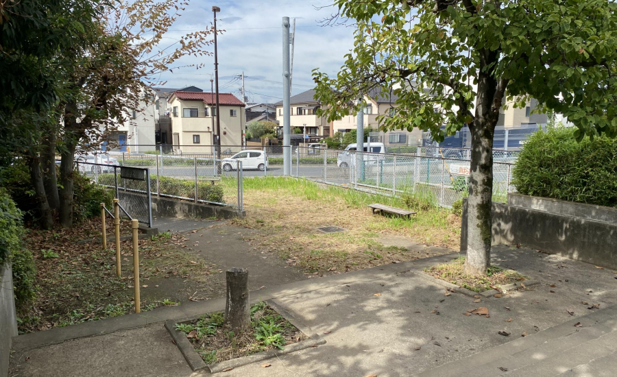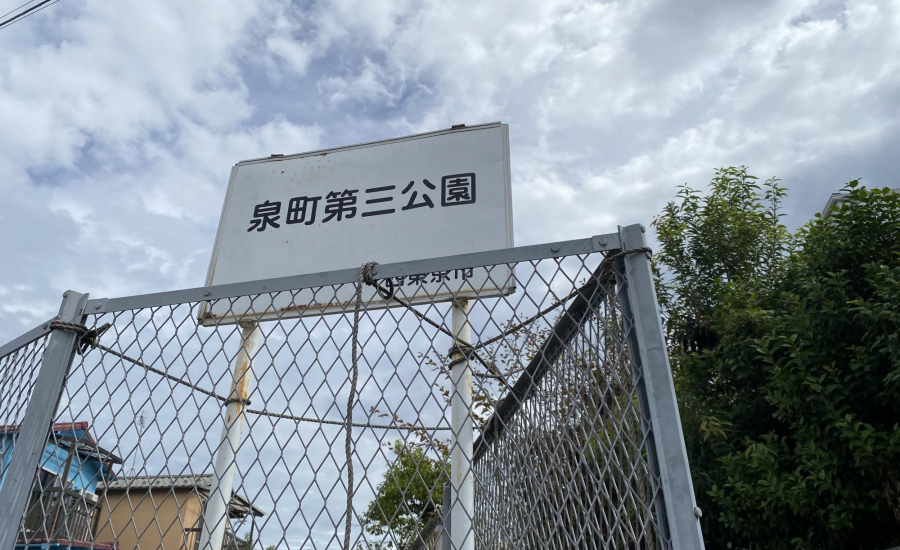 泉町第三公園は、大きな道路沿いにあり、団地側と道路側の2方向からアクセスできる少し変わった形をした公園です。