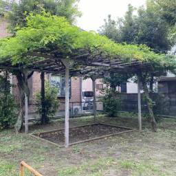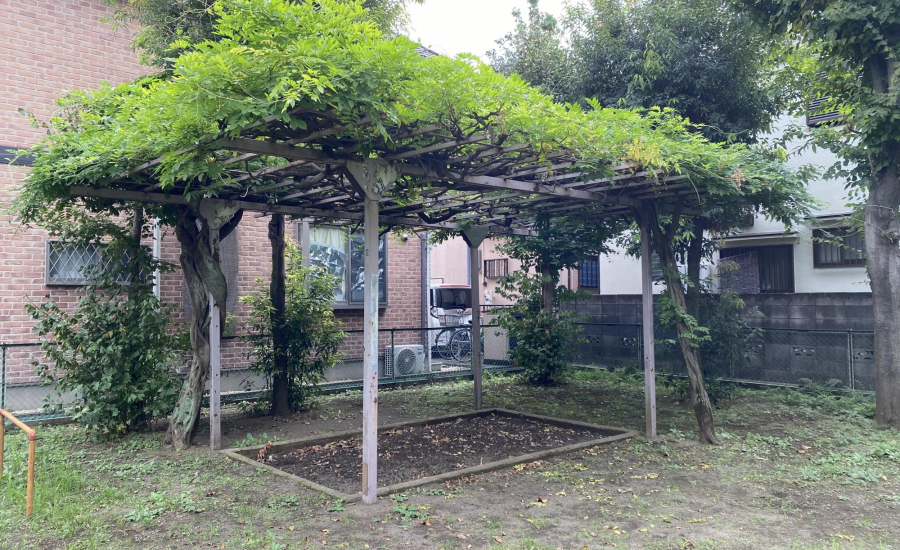 手入れの行き届いた藤棚は、心地よい木陰をつくりだしており、砂場で遊ぶ子どもを見守る保護者の休憩場所にも最適です。