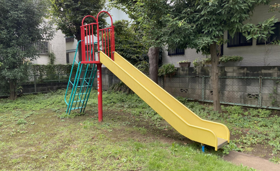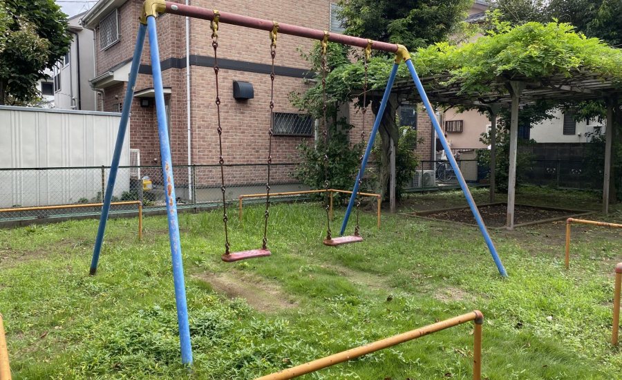 公園内にある遊具は、二人乗りのブランコ、藤棚の下にある砂場、低めの滑り台と、子どもたちに人気の定番アイテムがそろっています!