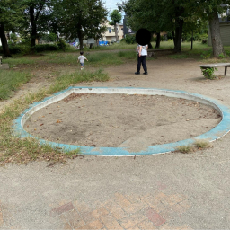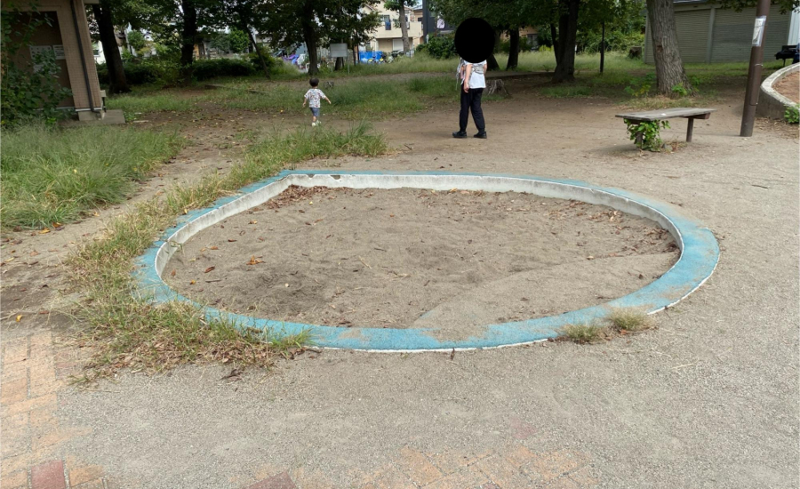 砂場は円形で、砂遊び道具を持った親子がよく遊びに来ているのを見かけます。