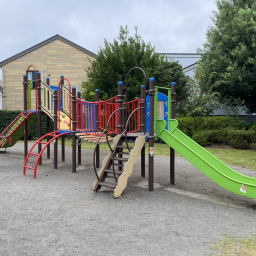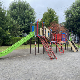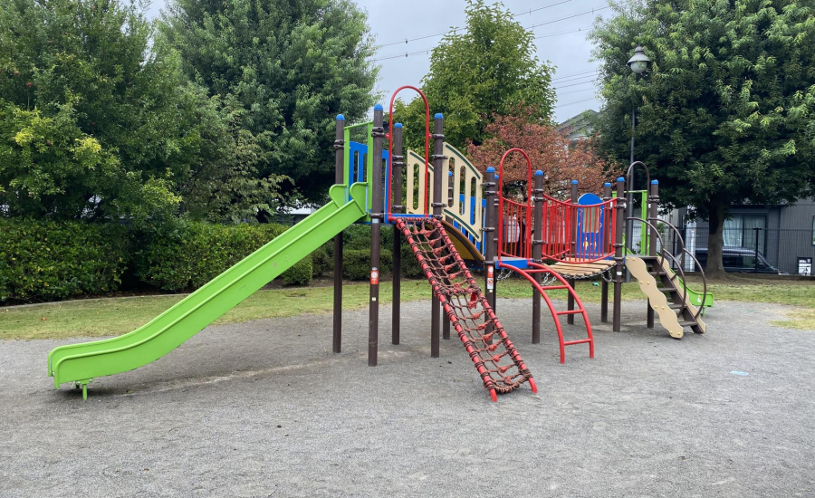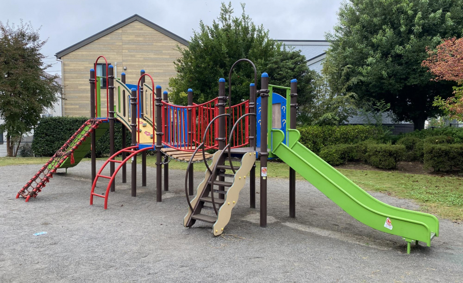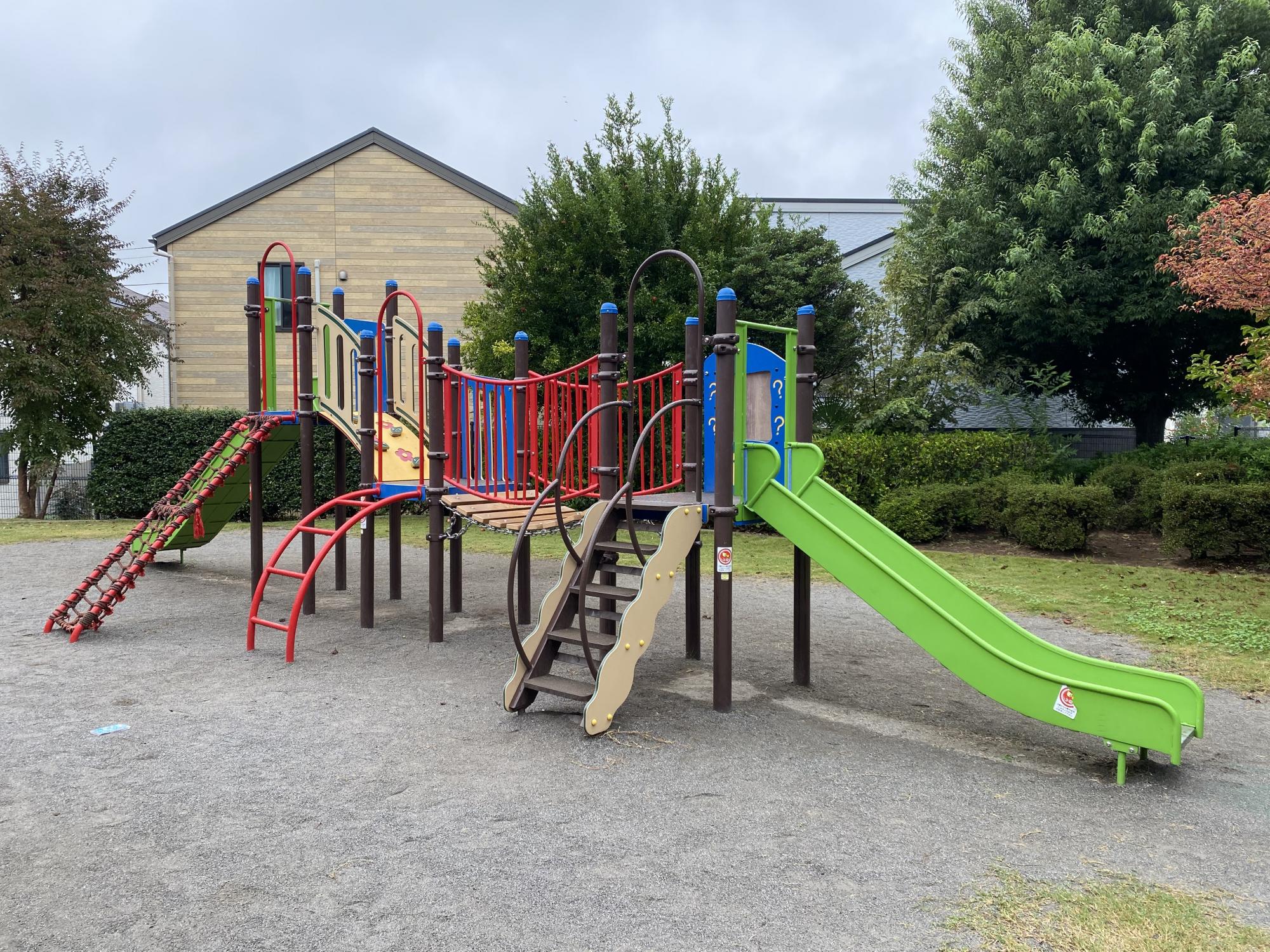 公園の奥にある遊具エリアにはカラフルな大型複合遊具が設置されており、両サイドに滑り台、赤いネット登りや吊り橋など、さまざまな仕掛けが揃っています。子ども達は滑り台を目指して、登ったり渡ったりしながら夢中で体を動かすことができますね♡