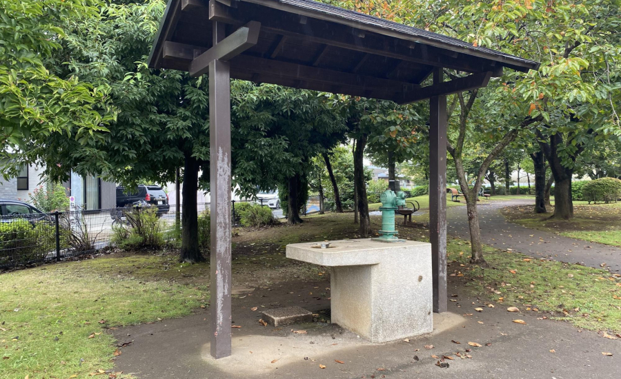 遊具のエリアから広場へ続く道には水飲み場や健康遊具、地域の歴史を感じる石碑もあり、親子でお散歩するのにもぴったりです。