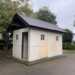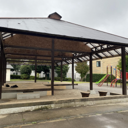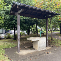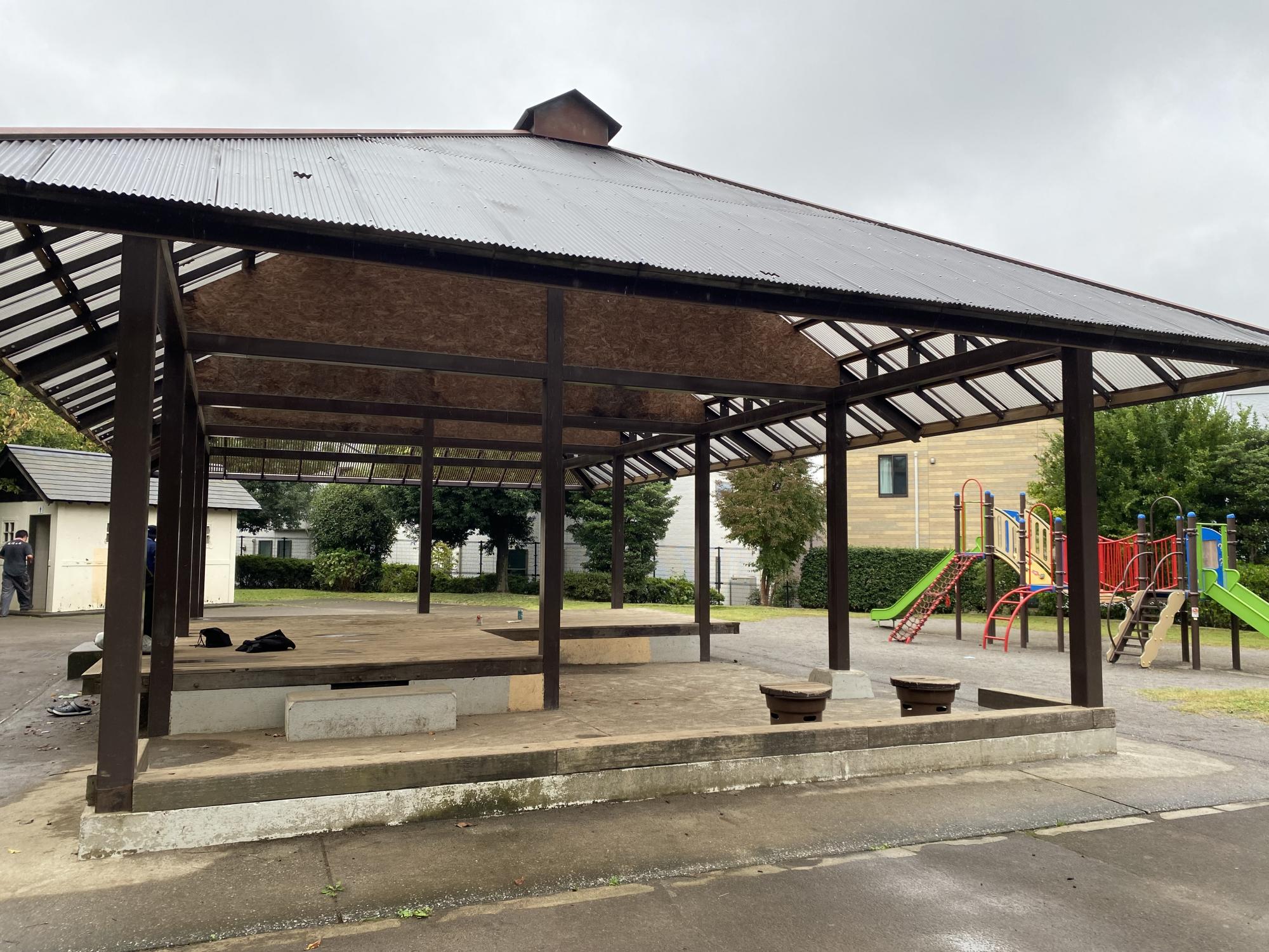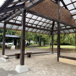 遊具のそばにはトイレと大きな屋根の休憩所もあり、休憩所内は座る場所がたくさん用意されています。向かい合ったり距離を取ったりできる工夫がされているので、小さい子ども連れファミリーや大人数のファミリーにも安心の環境です。