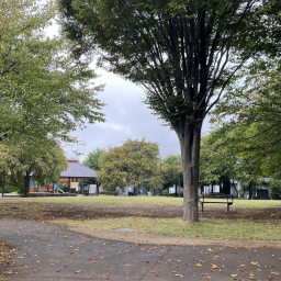 とても広く、遊具のあるエリアと広場のエリアで分かれています。広場は芝生がありピクニックにも向いてそうです。遊具のあるエリアには、日本家屋のような造りをした屋根の下に休憩用の椅子と、砂場が設置された面白い作りでした。