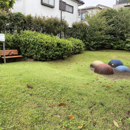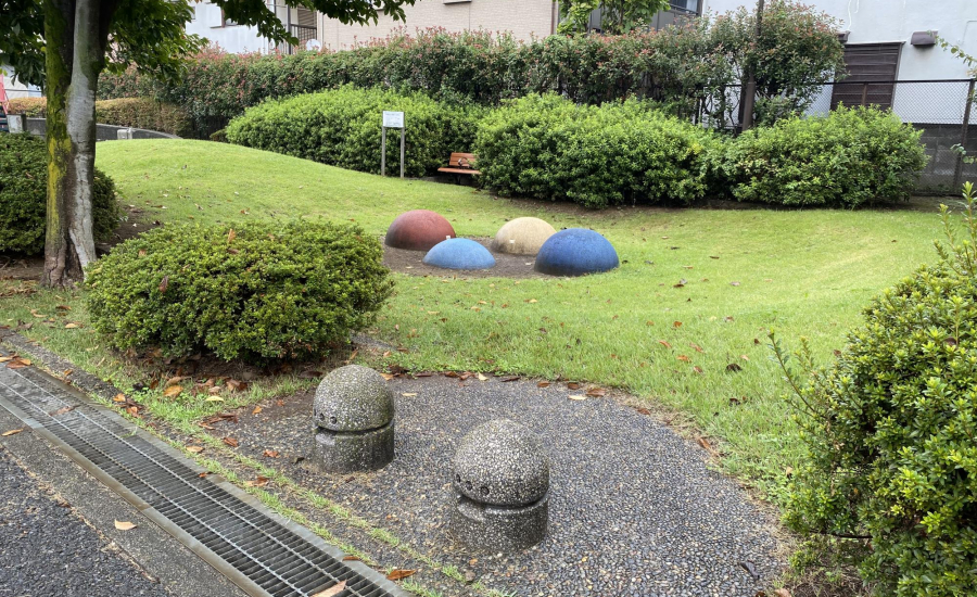 L字型の園内は公園には珍しくデザイン性を感じる造りでした。滑り台後ろの半円の通路、半球体が地面に埋め込まれ、芝生のある土は凹凸があり子どもが夢中になって遊べる要素が詰まっていました。遊具はもちろん地形でも遊べる公園です。