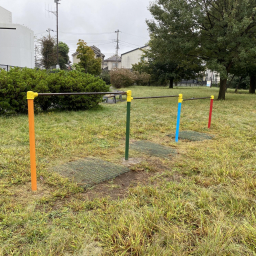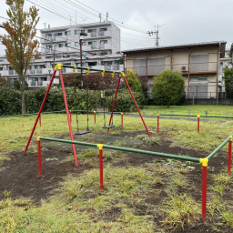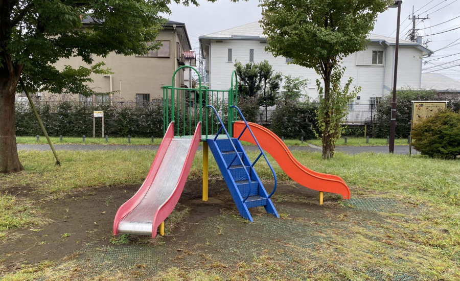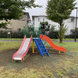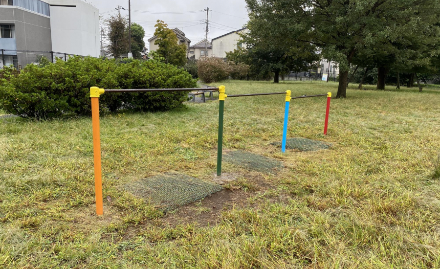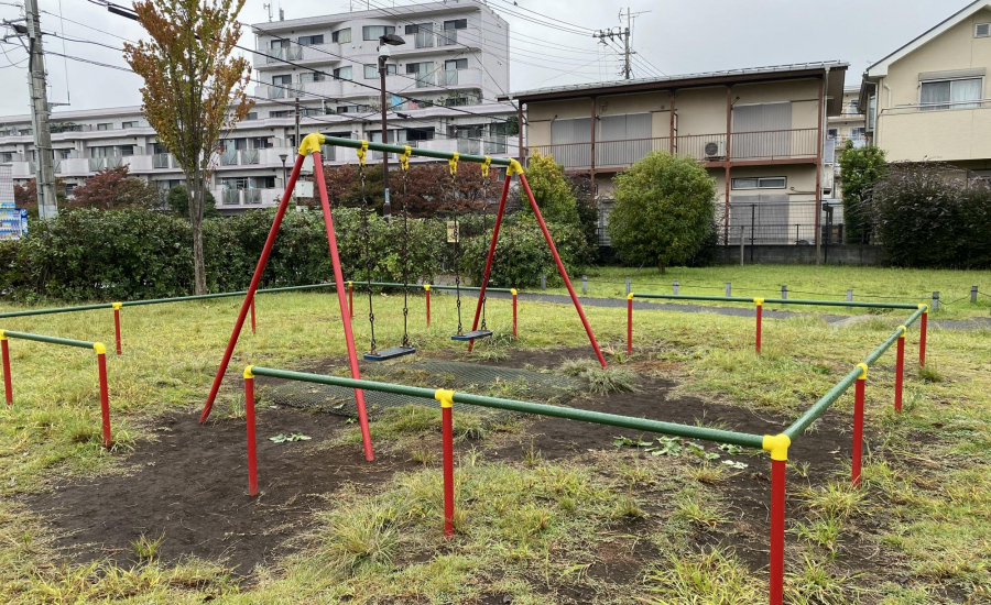 L字の公園の端には遊具が集まったエリアがあり、定番の遊具からこの公園にしかないような変わった遊具も設置されています♪