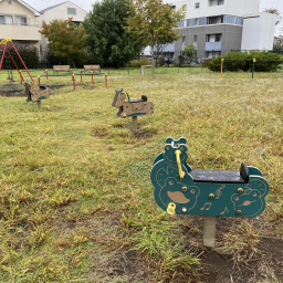 カエルや馬のモチーフが可愛らしいスプリング遊具が3台並んでおり、小さい子どもでも遊べる遊具があるのが素敵ですね。