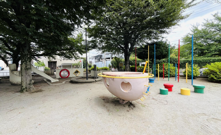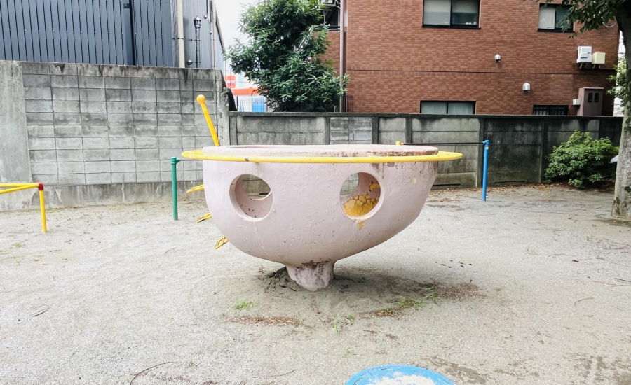 園の真ん中には、まるでUFOのようなユニークな遊具があります。足を止めて眺めたくなるデザインで、子どもたちにも大人気。手すりがついているので中に入ることができ、丸い窓から外をのぞくと、ちょっとしたワクワク気分が味わえます。
