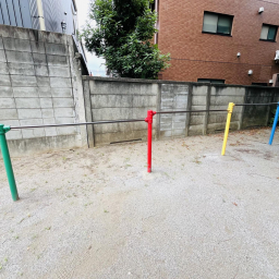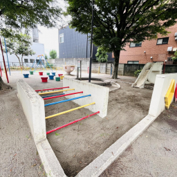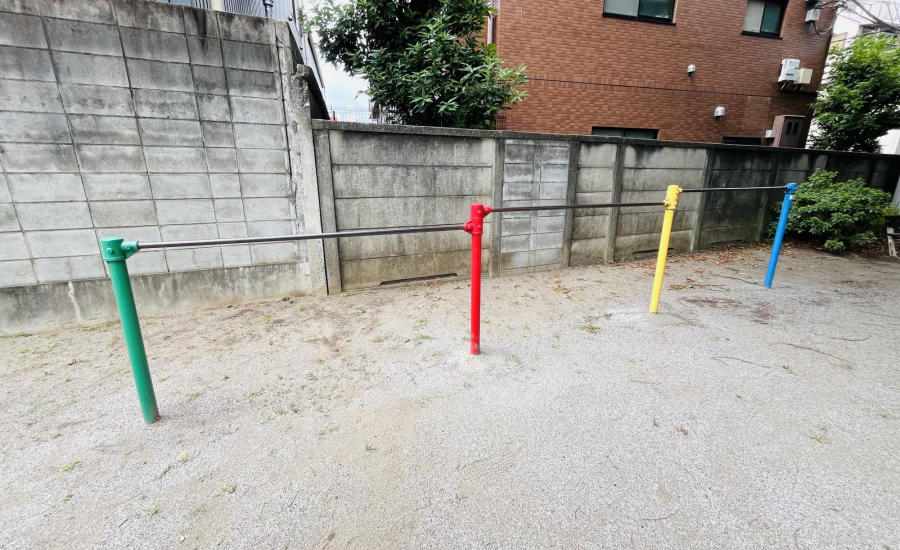 そばには、コンクリートの壁にカラフルな横棒が取りつけられた遊具も。手や足を使って一本ずつ進んだり、下をくぐったりと、遊び方は自由自在。まるで小さなトンネルを探検しているような気分を味わえます。