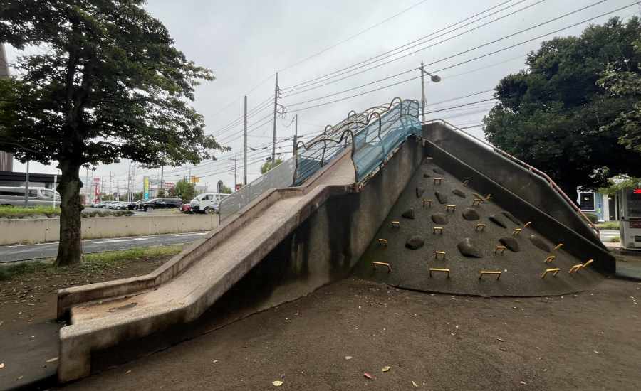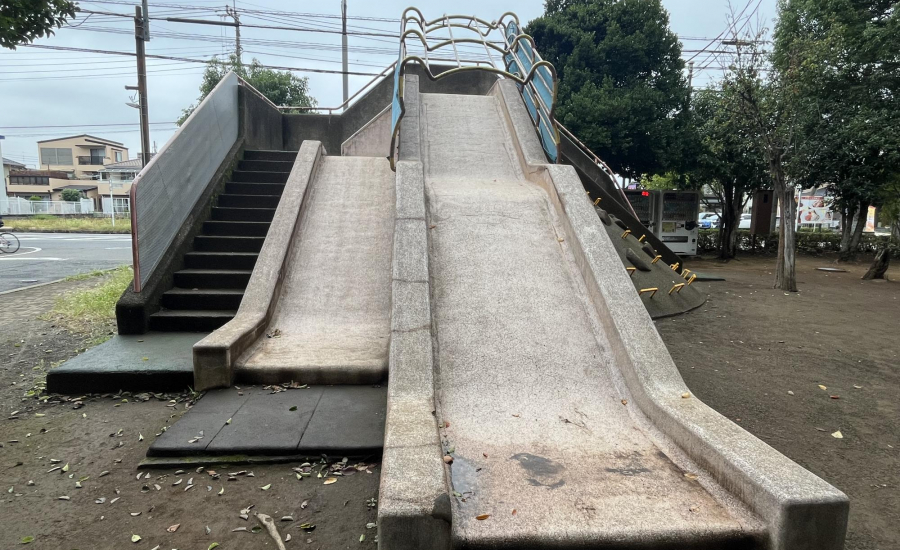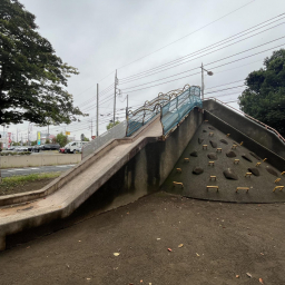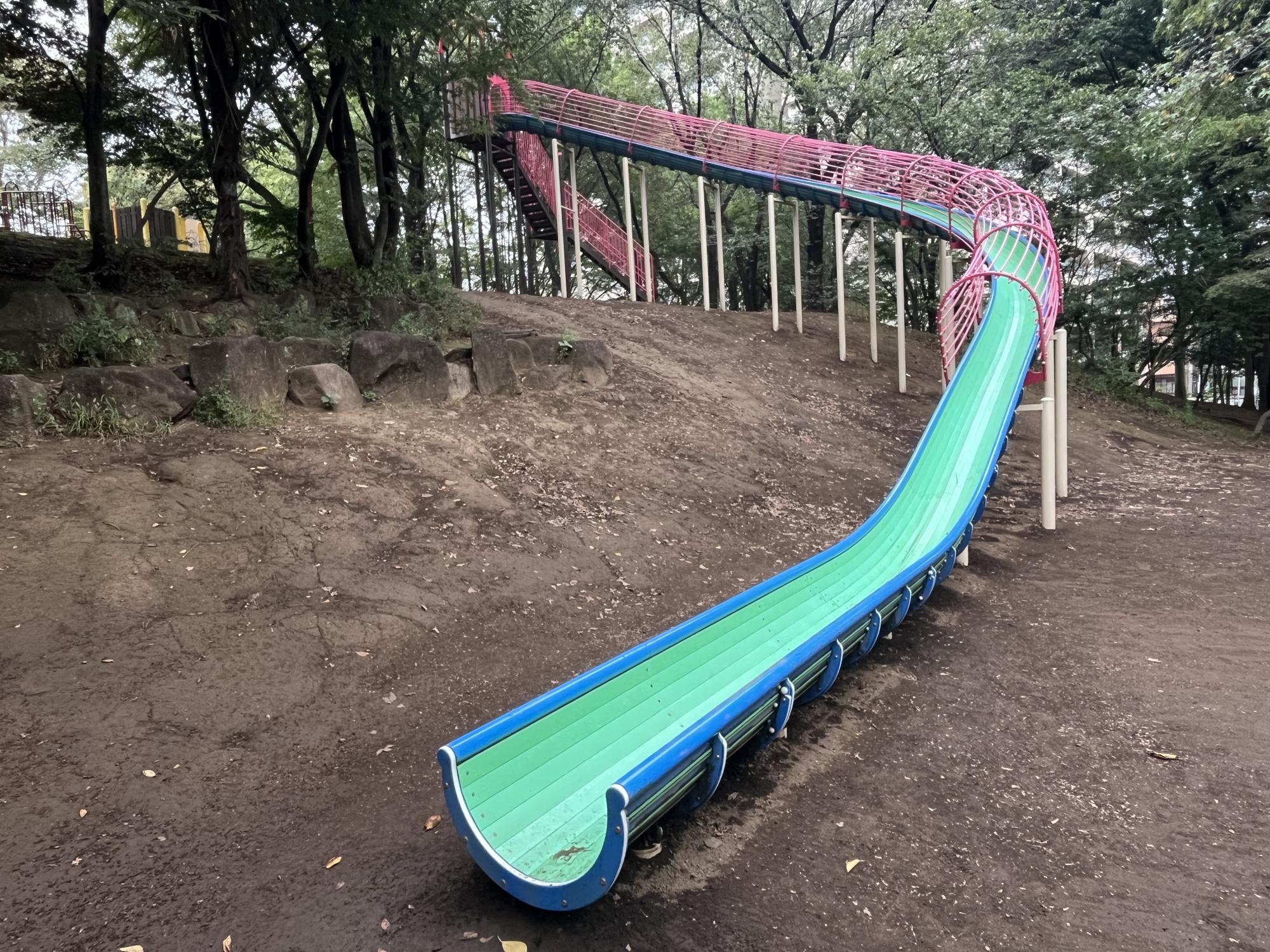 公園の真ん中あたりが山になっていて、そこを登ると大型の長いすべり台や小さいすべり台、アスレチック等の遊具があります。乳幼児~中学生くらいまで、幅広い年齢が楽しめるようになっています。