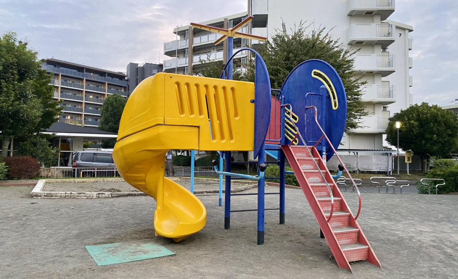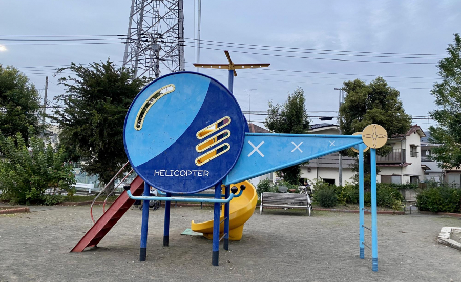広場の部分がとても広くとられた公園でした。目印の青いヘリコプターは男の子に人気が高く、たくさんの子ども達が遊んでいました。広場部分は複数人遊んでいても余裕があるので、パパママも安心して遊ばせられそうです。