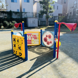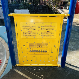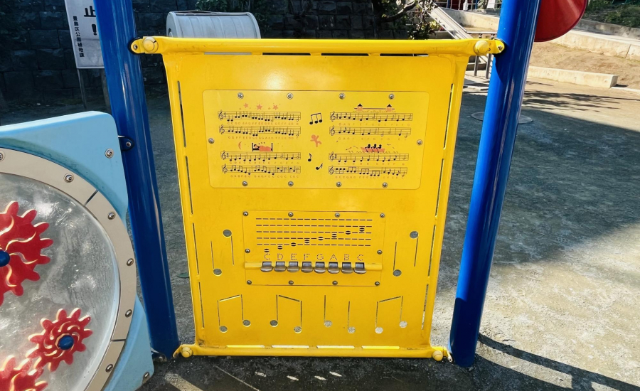 特に面白いのが、音階が鳴るパネルの遊具!「きらきら星」や「ロンドン橋」など子どもにおなじみの楽譜が黄色い板に描かれており、その下には銀色のバーがあります。バーを押すと音が鳴る仕組みになっていますよ。